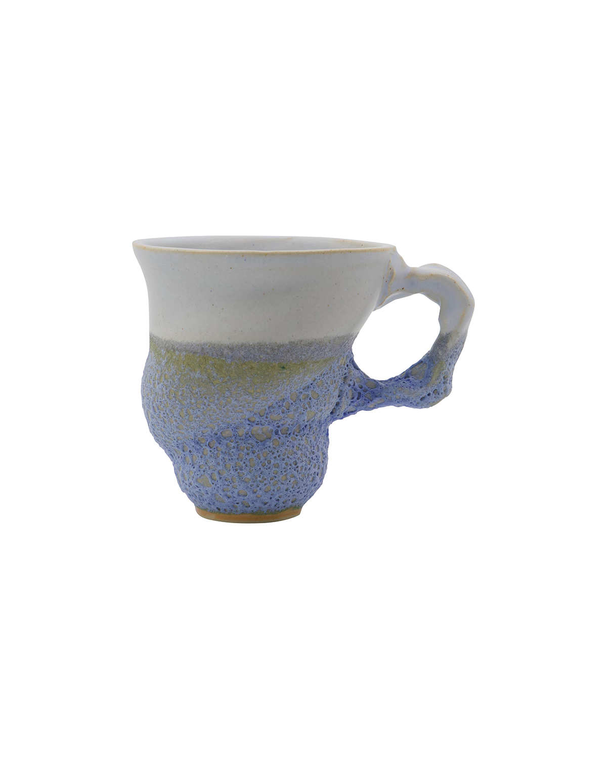 „Die hellblaue Farbe ist zart und die Glasur hat eine schaumige Textur, die mich an den Moment erinnert, wenn eine Welle am Ufer in weißen Schaum zerfällt. Die obere matte Glasur und der untere Teil des Bechers haben ein glänzendes, fast glänzendes Aussehen, das durch eine schöne Mischung aus blauen und sandigen Farben ergänzt wird“, erklärt Solveig.