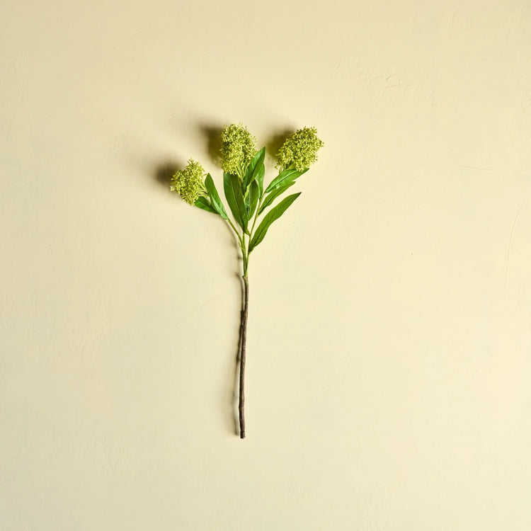 Ein künstlicher und doch täuschend echter grüner Zweig mit detailreichen Blütenrispen, die der natürlichen Skimmie in nichts nachstehen. Setze ihn als einzelnen Akzent in Szene oder kombiniere mehrere für ein üppiges Arrangement.