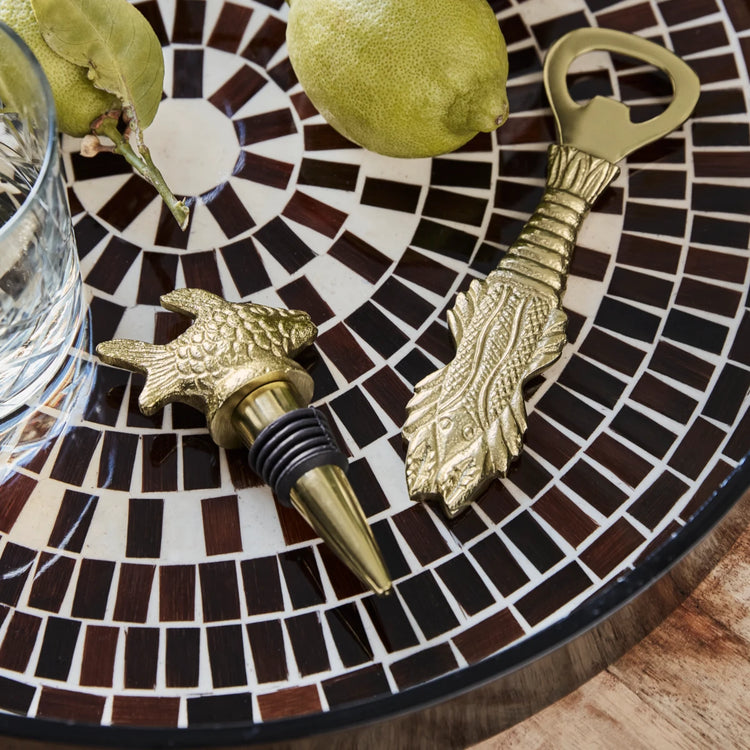 Verleihen Sie Ihrer Küche oder Bar einen Hauch von Eleganz mit diesem stilvollen Set aus Flaschenverschluss und Öffner. Die antike Goldoptik und die einzigartigen Designs von Fisch und Hummer machen diese Utensilien zu einem echten Hingucker und gleichzeitig zu einem funktionalen Accessoire.- Antike Goldoptik- Set aus 2 Teilen- Fisch- und Hummerdesign- Praktisch und dekorativFügen Sie Ihrer Küche eine künstlerische Note hinzu!