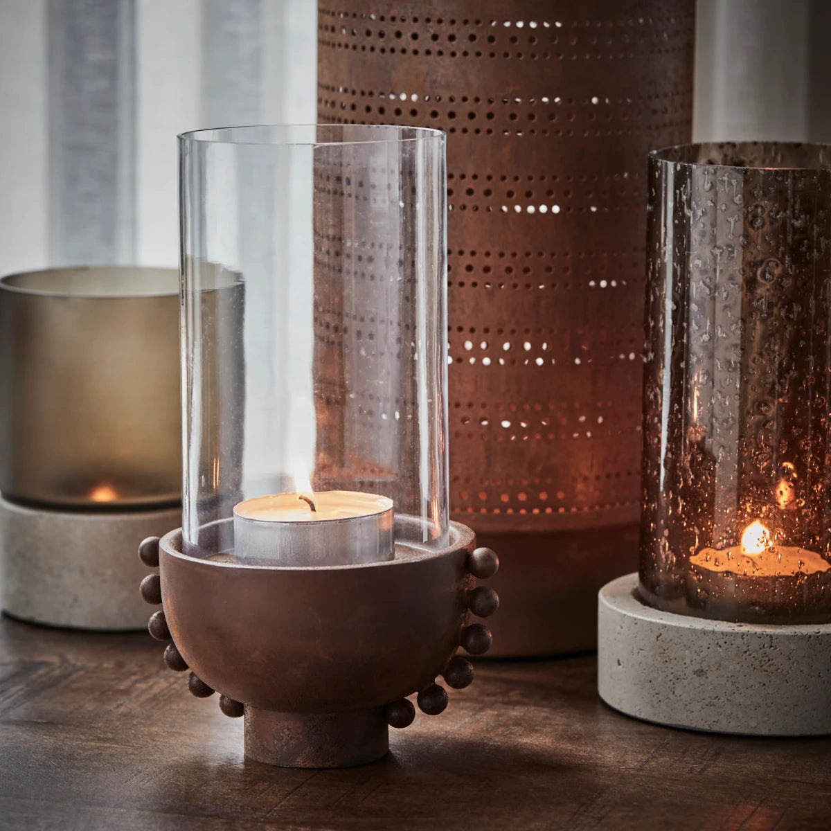 Verleihen Sie Ihrem Zuhause Wärme und Charakter mit diesem Kerzenhalter aus rostfarbenem Eisen und transparentem Glas. Dieses handgefertigte Stück zieht die Aufmerksamkeit auf sich und verleiht Ihrer Einrichtung eine persönliche Note.- Handgefertigtes Unikat- Ansprechendes rostfarbenes Eisen- Transparentes Glas für Eleganz- Perfekt für BlockkerzenVeredeln Sie Ihren Raum mit diesem wunderschönen Kerzenhalter.