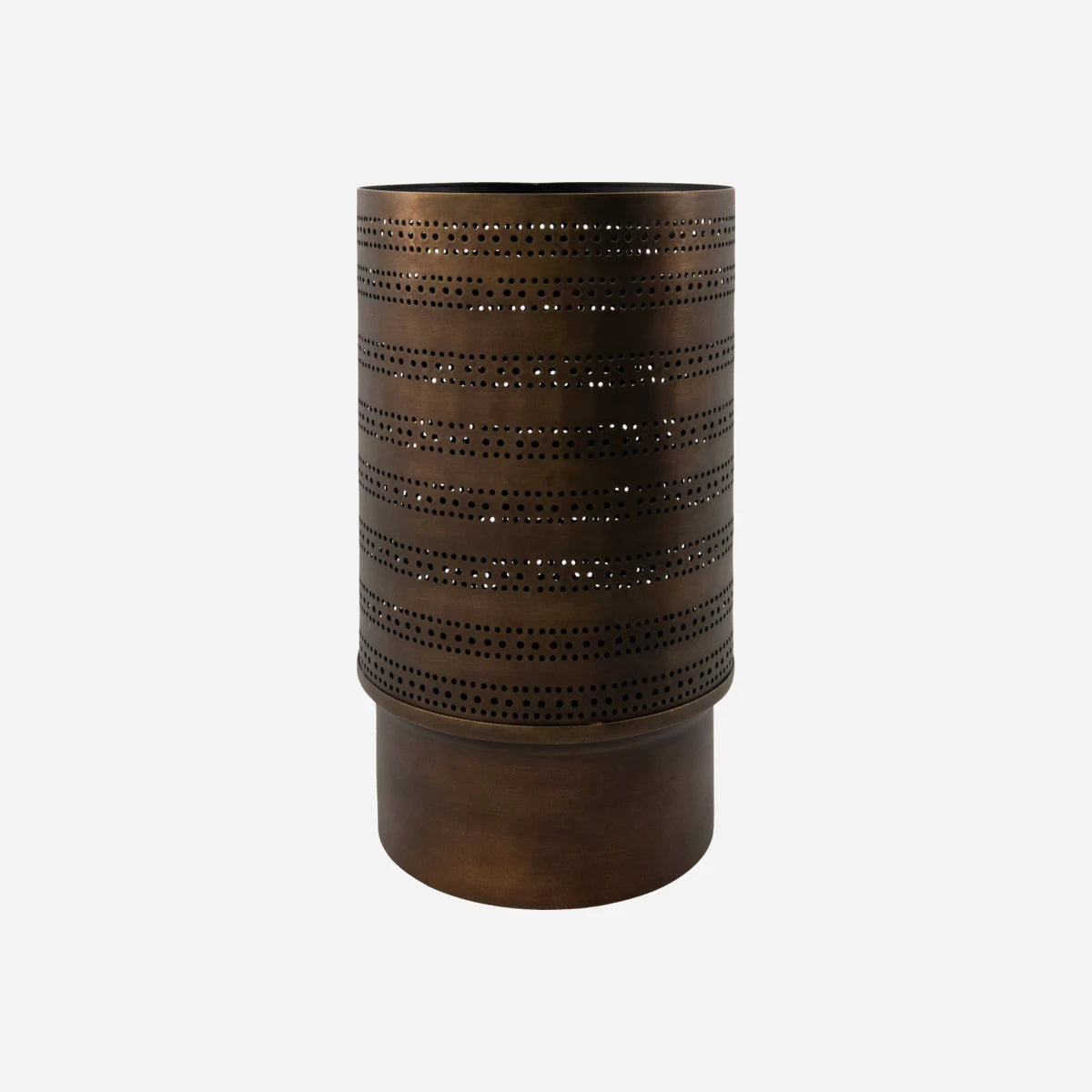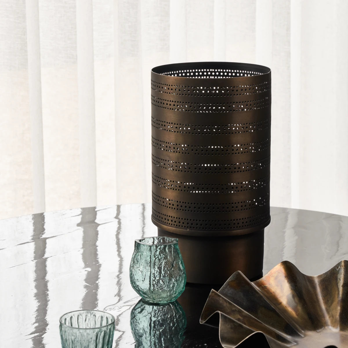Mit seinem ausgeschnittenen Design schafft der große Mesu-Kerzenhalter von House Doctor die richtige Atmosphäre in Ihrem Zuhause. Das Eisen ist mit einem ausgeschnittenen Muster in Form kleiner Kreise versehen, wodurch das Licht verspielte Schatten an die Wände wirft. Kombinieren Sie Mesu mit Kerzenhaltern in ähnlichen Brauntönen oder mit Ihren Lieblingsschmuckstücken und Vasen für eine persönliche Präsentation auf Ihrem Couchtisch. Das ist alles, was Sie brauchen, um die richtige Stimmung für herbstliche Abende auf dem Sofa zu schaffen.