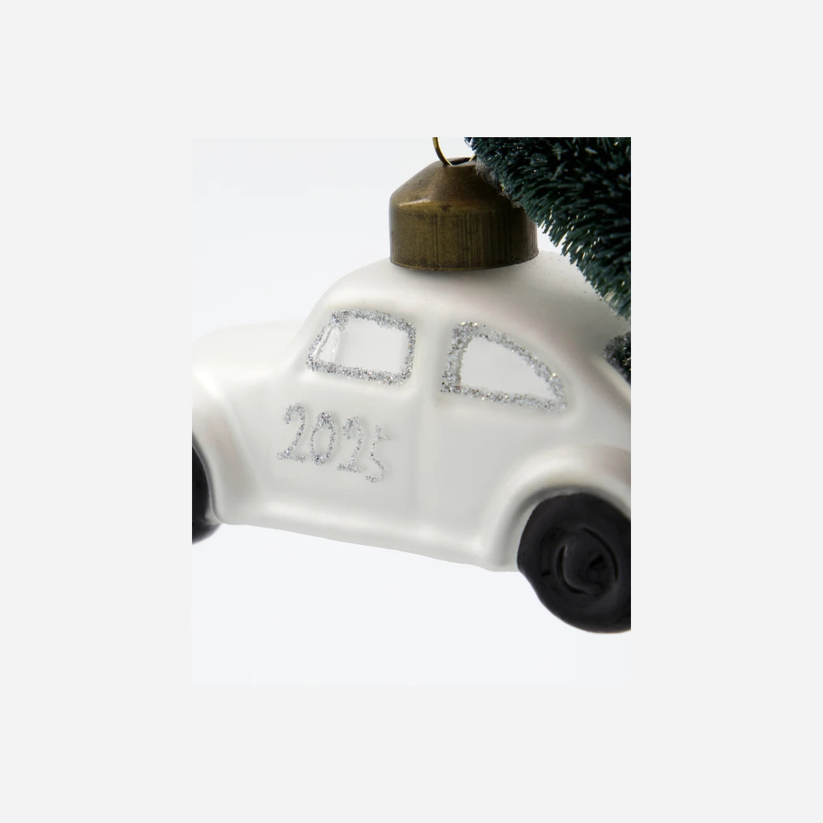 Verleihen Sie Ihrem Weihnachtsbaum mit diesem mundgeblasenen Glasornament einen Hauch von Nostalgie und Charme. Der weiße Wagen mit dem Jahr „2025“ in funkelndem Silberglitter erinnert an die Tradition, den Weihnachtsbaum nach Hause zu bringen. Auf dem Dach thront ein detailreich gestalteter Weihnachtsbaum, der die festliche Stimmung perfekt ergänzt.