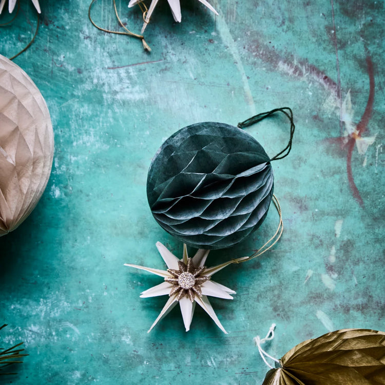 Fügen Sie Ihrem Zuhause einen Hauch von Weihnachtszauber hinzu mit diesen handgefertigten grünen Papierornamenten. Mit ihrer runden Form und der lebendigen grünen Farbe fügen sie sich perfekt in jedes weihnachtlich geschmückte Zuhause ein und schaffen eine warme, persönliche Atmosphäre.
