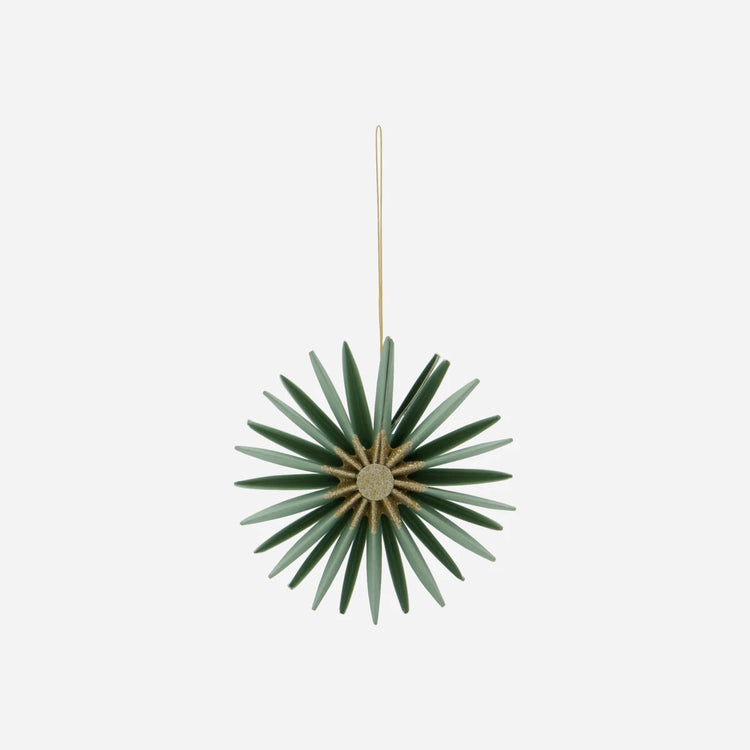 Verleihen Sie Ihrem weihnachtlich geschmückten Zuhause einen eleganten und femininen Touch mit diesen handgefertigten Papierornamenten. Die grünen Blumenornamente mit einer champagnefarbenen Glimmerrosette in der Mitte sind modern und ansprechend.