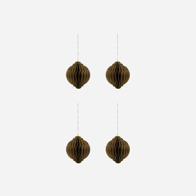 Handgefertigte Papierornamente bereichern Ihre Weihnachtsdekoration mit einem Hauch von Eleganz und Wärme. Die braunen Ornamente besitzen eine honigwabenartige Struktur mit handbemalten Goldglitter-Kanten, die das Licht auf magische Weise einfangen.