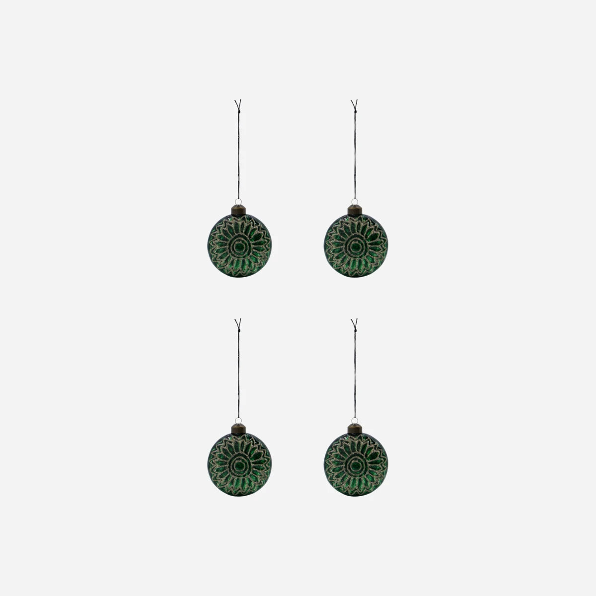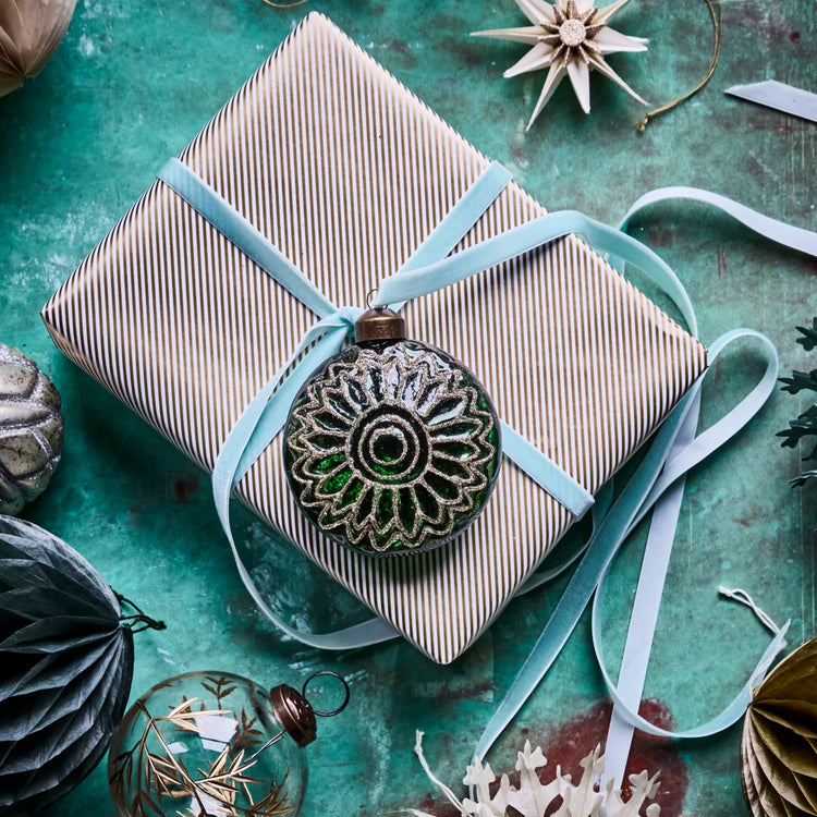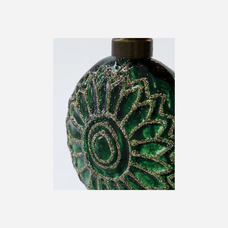Verleihen Sie Ihrem Weihnachtsbaum einen Hauch von Eleganz mit diesen mundgeblasenen Glasornamenten. Die klassische dunkelgrüne Farbe wird durch ein wunderschönes Muster in champagnerfarbenem Glitzer ergänzt. Die runde, leicht abgeflachte Form verleiht den Ornamenten ein modernes und elegantes Aussehen.