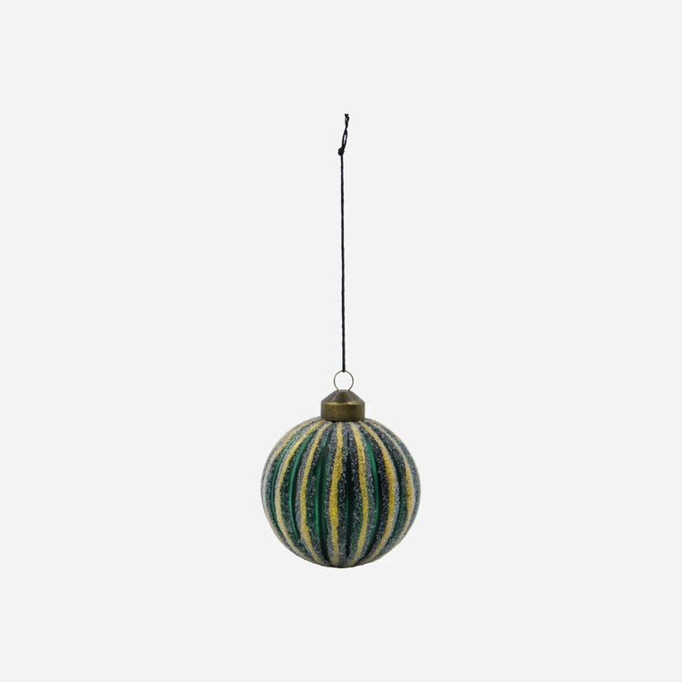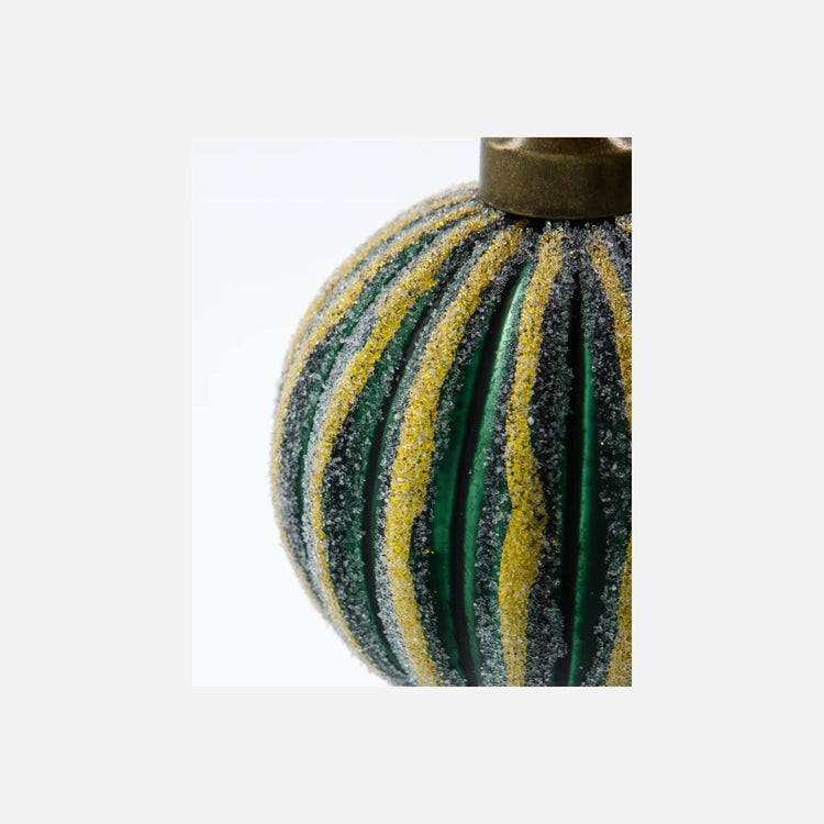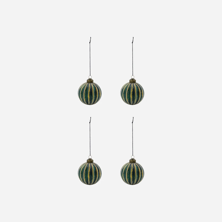 Verleihen Sie Ihrem Weihnachtsbaum mit diesen handgefertigten Glaskugeln ein elegantes und zeitloses Flair. Das Set aus vier mundgeblasenen Ornamenten besticht durch eine tiefdunkelgrüne Farbe mit kunstvollen, frostigen Streifen. Perfekt für Ihre festliche Dekoration.