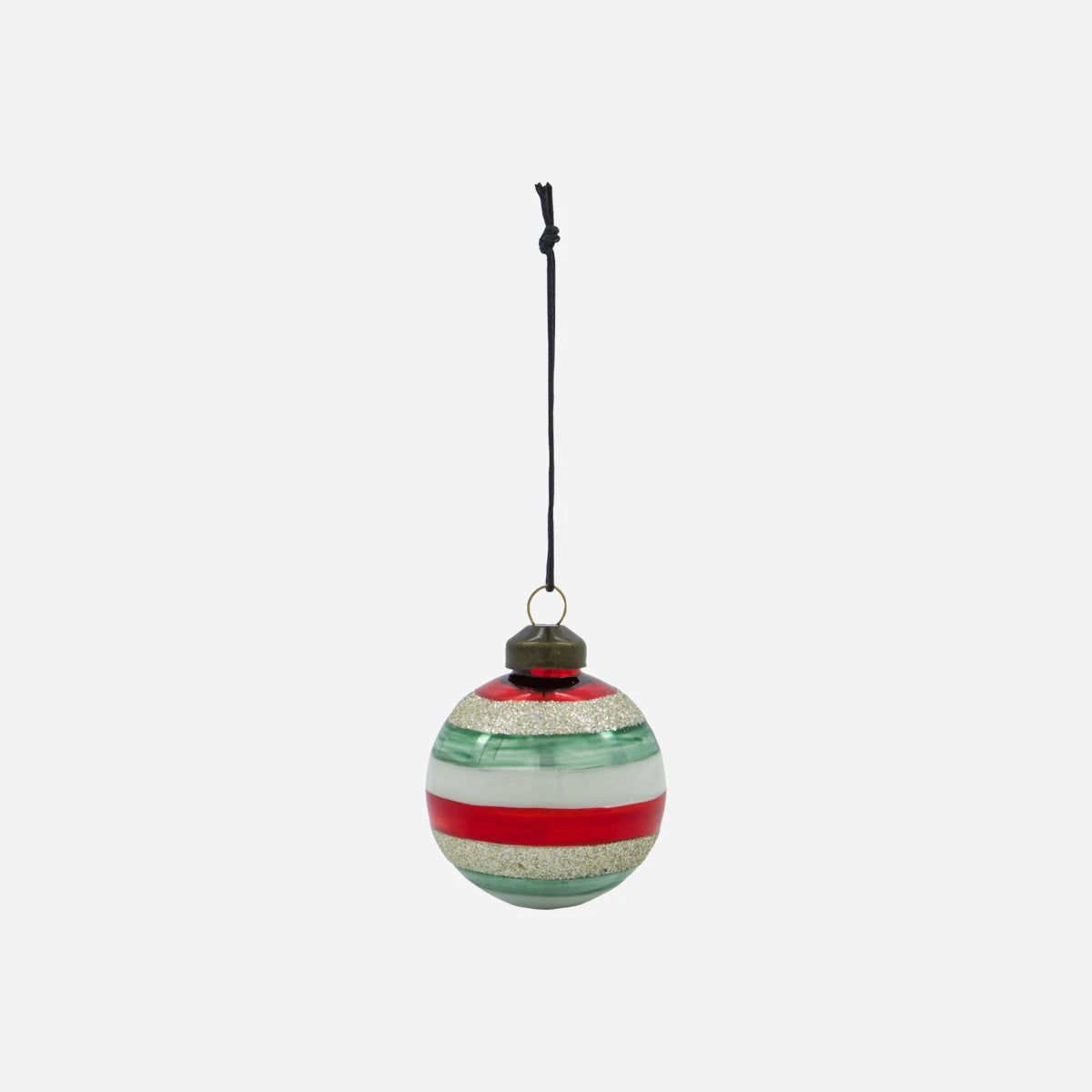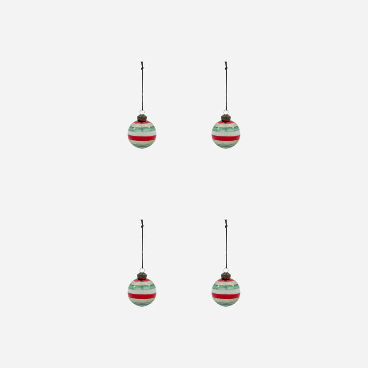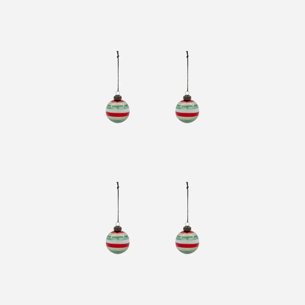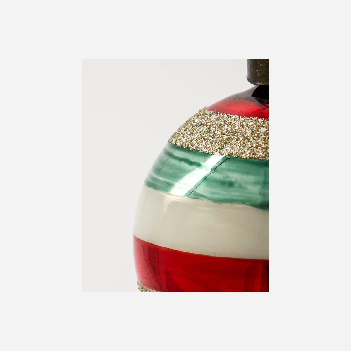 Verleihen Sie Ihrem Weihnachtsfest mit diesem Set aus vier mundgeblasenen Glasornamenten eine besondere Note. Die handbemalten Streifen in klassischen Farben wie Grün, Weiß und Rot, ergänzt durch funkelnden Champagner-Glitter, schaffen eine festliche Atmosphäre am Weihnachtsbaum, an einem Kranz oder als Teil einer Tischdekoration.