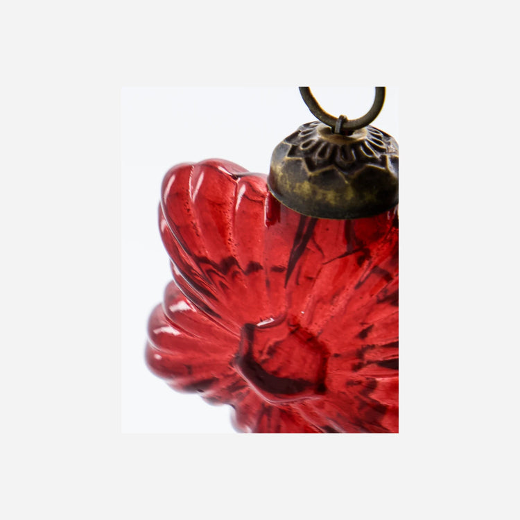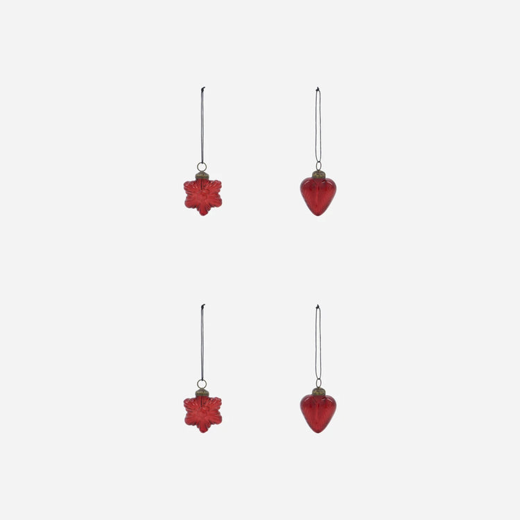 Verleihen Sie Ihrem Weihnachtsbaum einen Hauch von Nostalgie mit diesem Set aus vier handgefertigten Ornamenten. Die warmen, dunklen Rottöne der Glasanhänger strahlen Gemütlichkeit aus. Diese Ornamente, in Herz- und Blumenform, sind perfekt für eine festliche Stimmung.