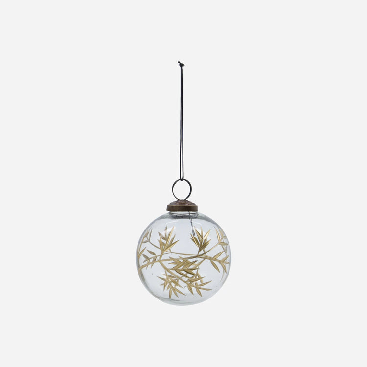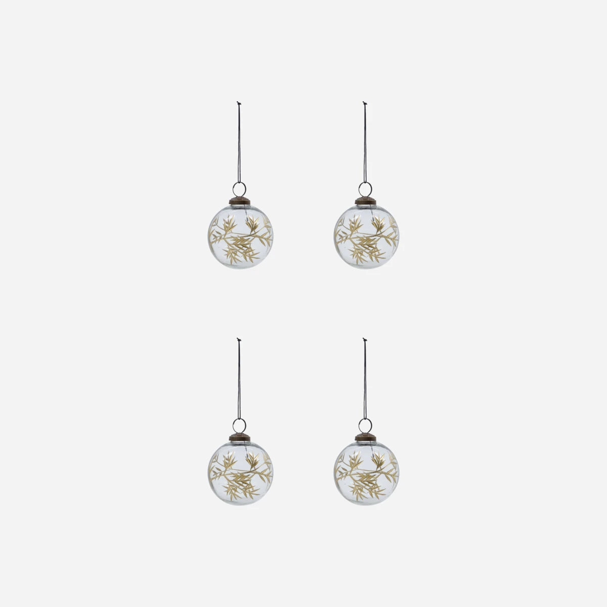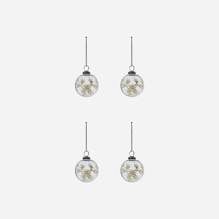 Verleihen Sie Ihrem Weihnachtsfest mit diesen eleganten Ornamenten aus transparentem Glas eine besondere Note. Das Set aus vier handgefertigten Stücken besticht durch ein vintage-inspiriertes Zweigmotiv, das kunstvoll mit goldener Farbe handbemalt wurde.