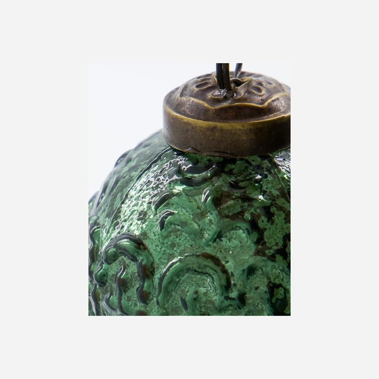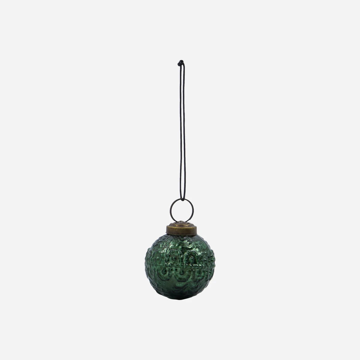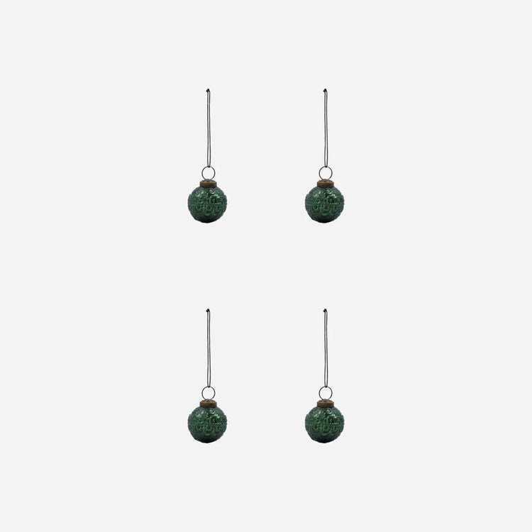 Das kugelförmige Ornament aus grünem Glas verleiht Ihrer Weihnachtsdekoration einen klassischen Touch. Jedes der vier handgefertigten Stücke besticht durch ein feines Muster mit Vintage-Referenzen und strahlt zeitlose Eleganz aus.