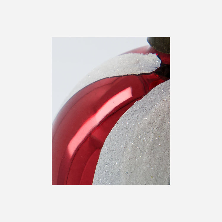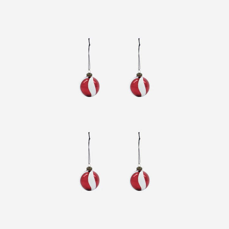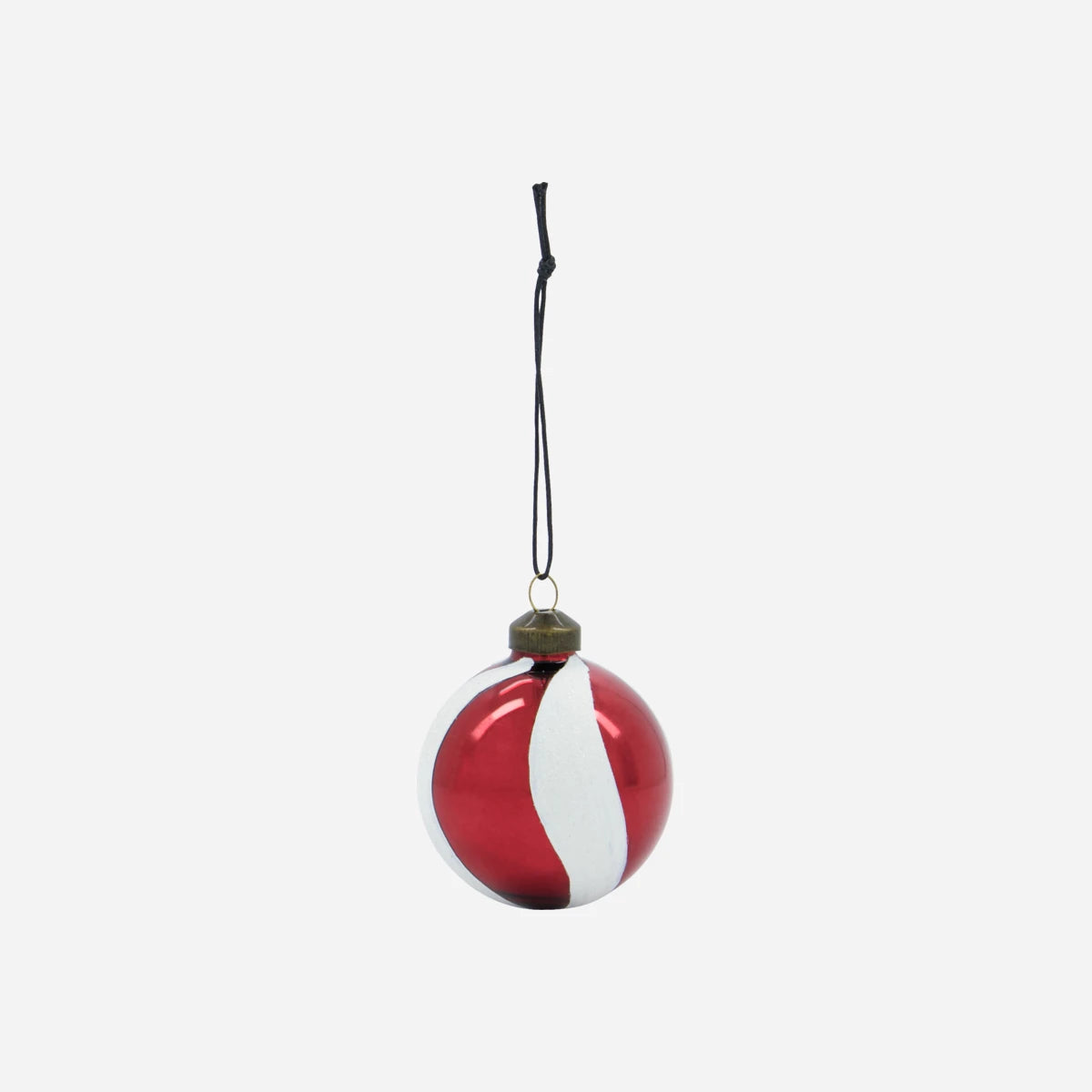 Verleihen Sie Ihrem Zuhause eine verspielte Weihnachtsstimmung mit diesen mundgeblasenen Glasornamenten in Rot und Weiß. Die weißen, glitzernden Twist-Streifen heben sich elegant vom roten Hintergrund ab und schaffen ein festliches Flair.