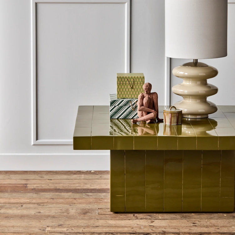 Dieser Couchtisch setzt ein starkes Statement in das Wohnzimmer. Die sattgrüne Hochglanz–Lackierung in Kombination mit den handgearbeiteten Mangoholzkacheln verleiht jedem Raum einen modernen und coolen Touch. Ein auffälliges Design, das stilvolle Akzente setzt und zur kreativen Neugestaltung von Sofaecken inspiriert.