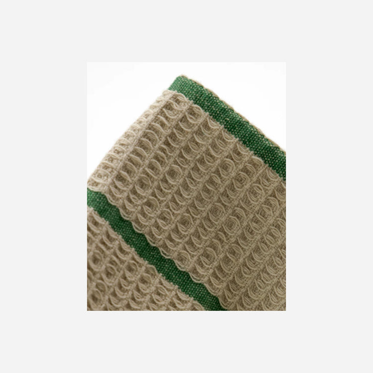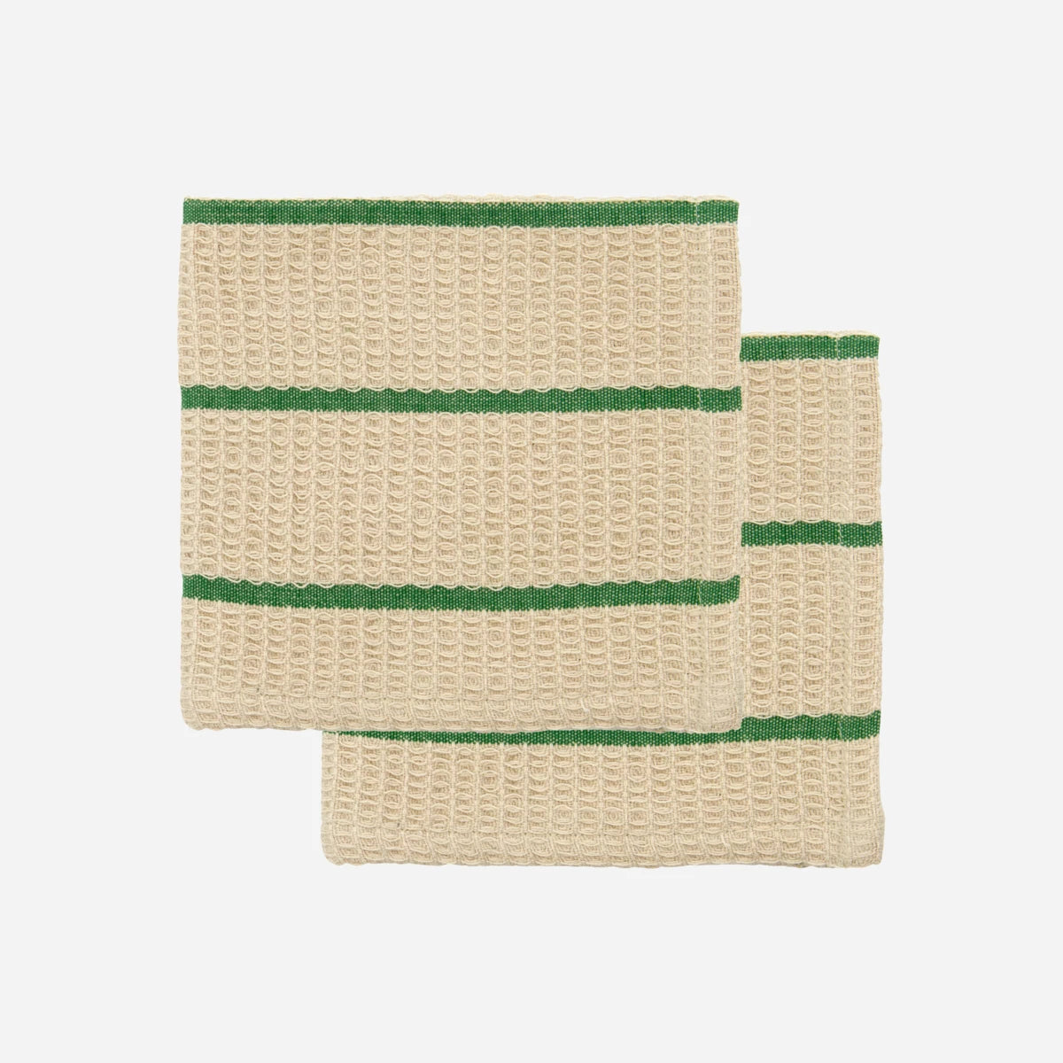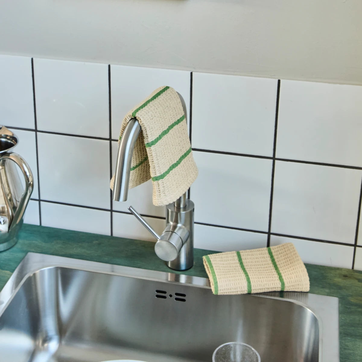 Dieses Set aus zwei Baumwoll-Spültüchern vereint Funktionalität mit einem natürlichen, gestreiften Design in Sand- und Grüntönen. Der Stoff fühlt sich angenehm weich an und ist dank seiner hohen Saugfähigkeit ideal für den täglichen Gebrauch.