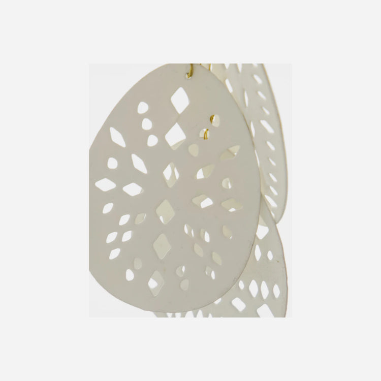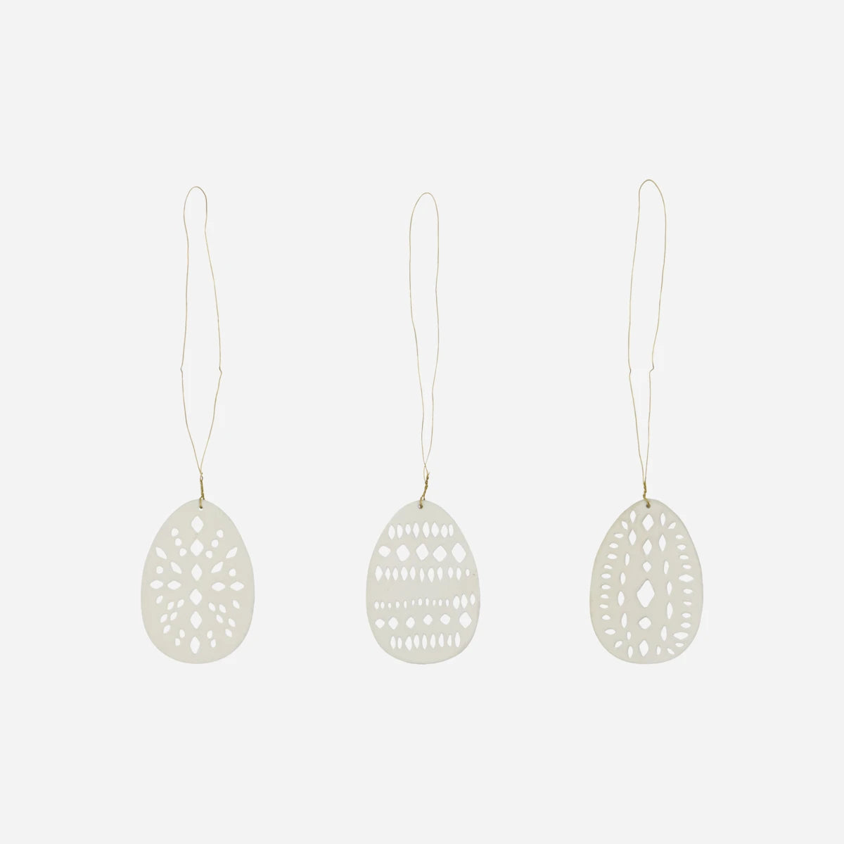Set mit drei eiförmigen Metallornamenten mit filigranem Durchbruchmuster und matter beiger Beschichtung. Zum Aufhängen geeignet.