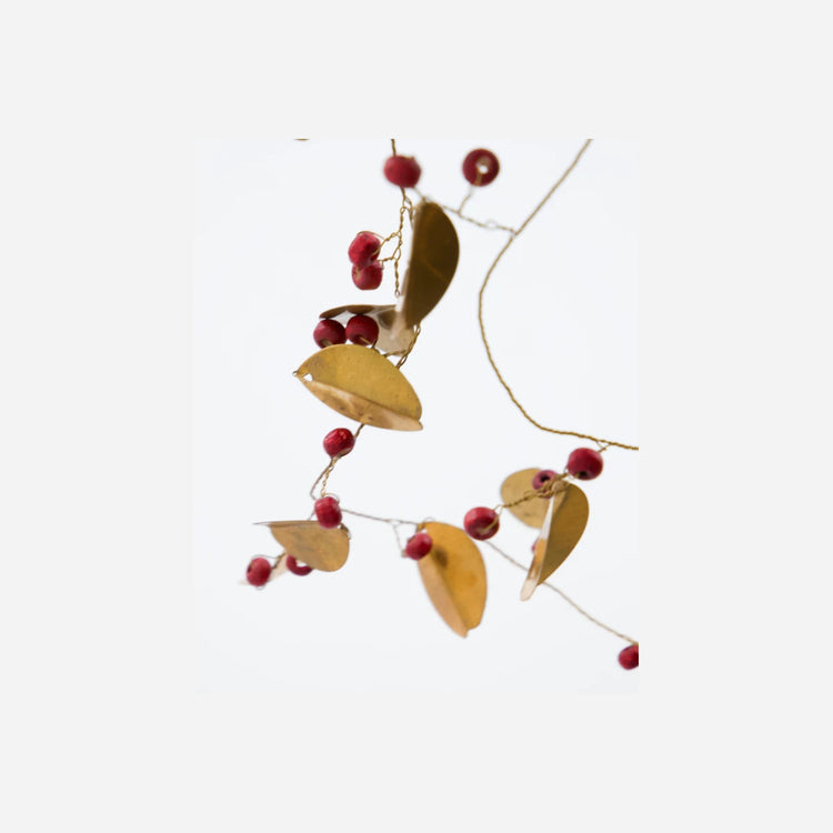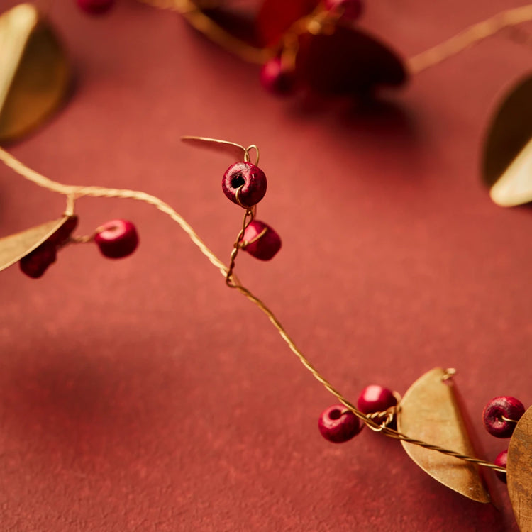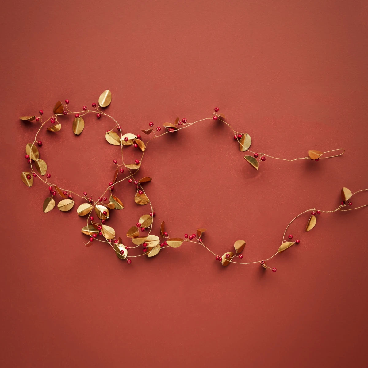 Goldene Blätter und rote Holzperlen verleihen dieser Girlande den genau richtigen, eleganten Look für Weihnachten. Lass sie Teil deiner Tischdeko oder eines Kranzes werden, oder benutze sie an einem Zweig von der Decke hängend. Dank des Metalldrahtes und die zwei Schlaufen, kann die Girlande nach Lust und Laune geformt und sogar an einen Haken befestigt werden. Die klassischen Farben und das vielseitige Design machen aus der Girlande den idealen Begleiter für deine persönliche Weihnachtsdeko.