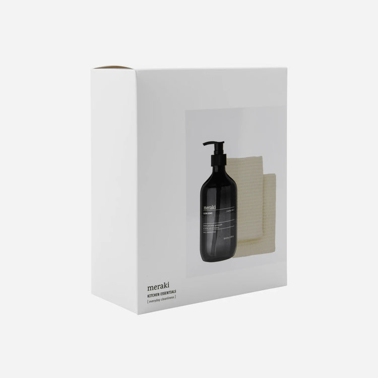Das Set kombiniert ein aromatisch duftendes Spülmittel mit einem weichen, beigen Spültuch für den Alltag.