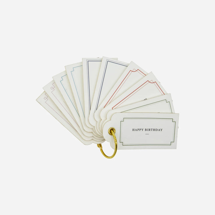 Bringen Sie einen Hauch von Eleganz in Ihr Home-Office oder Ihre Geschenkverpackungen mit diesen charmanten kleinen Geschenkanhängern. Die Verpackung enthält 10 individuell gestaltete Anhänger in fünf verschiedenen Farben, die auf einem praktischen Eisenring organisiert sind. Wählen Sie aus einer Vielzahl von Botschaften, darunter "Happy Birthday", "Just Because", "Congratulations", "Thank You" und "Wishing You...", um die perfekte Nachricht für jeden Anlass und Empfänger zu finden.- Fünf verschiedene Farben- Praktisch organisiert auf Eisenring- Zehn einzigartige Nachrichten- Perfekt für GeschenkeVerleihen Sie Ihren Geschenken eine persönliche Note mit diesen vielseitigen Geschenkanhängern.