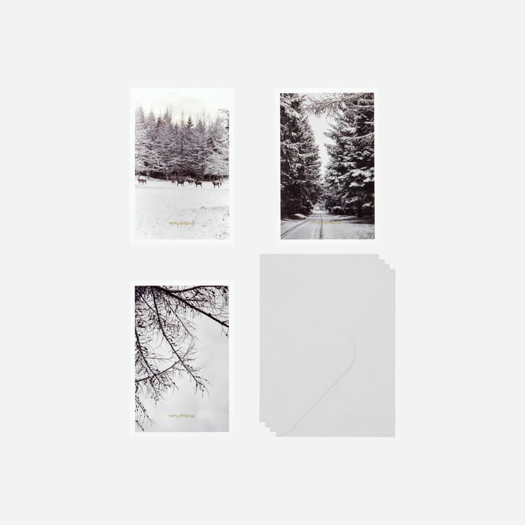 Verschenken Sie festliche Grüße mit diesen eleganten Grußkarten. Jede der sechs Karten zeigt ein einzigartiges Wintermotiv, verziert mit goldglänzendem 'Merry Christmas'-Text. Die hochwertigen Karten in Weiß kommen mit passenden Umschlägen.