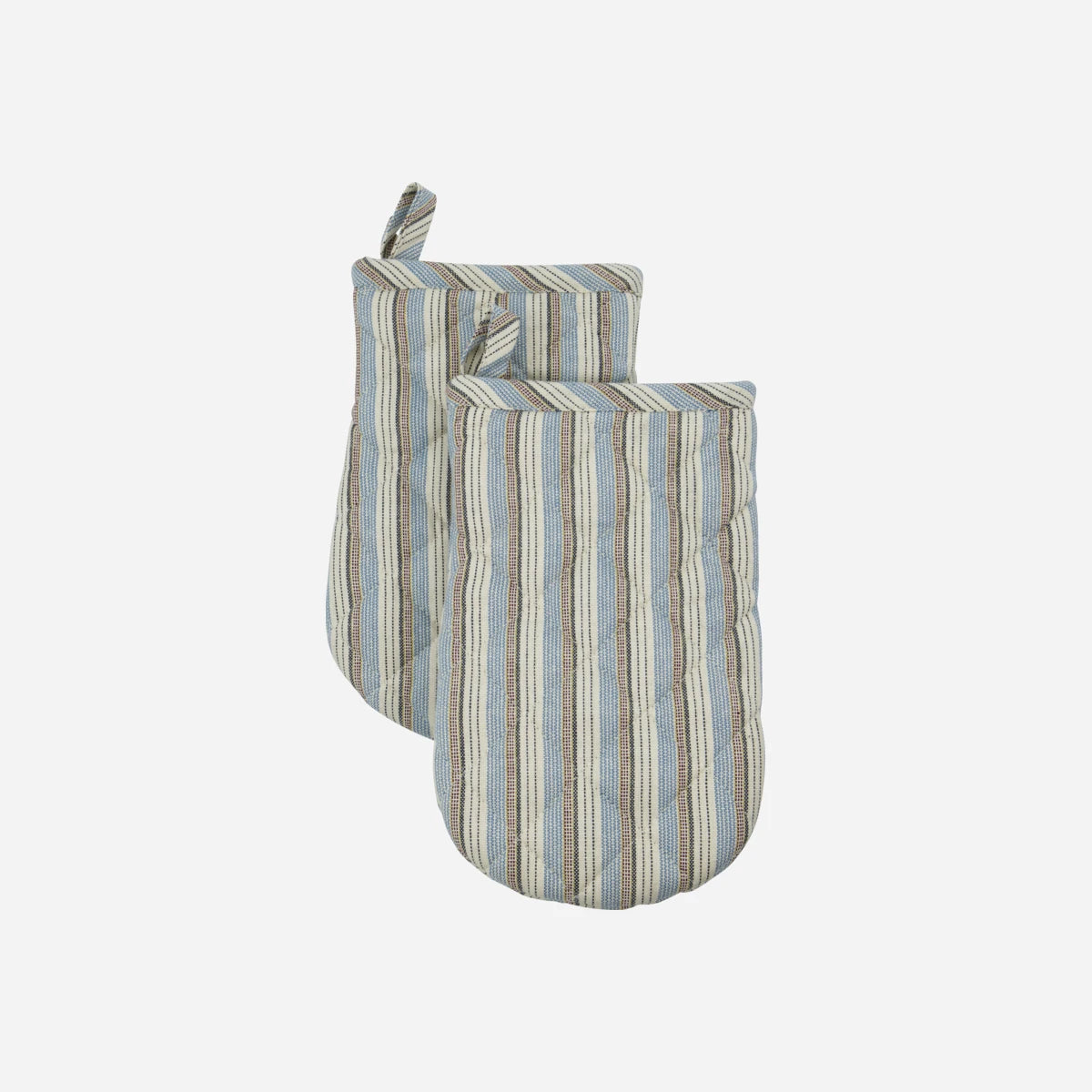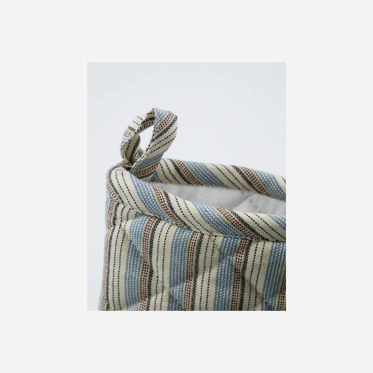 Die feinen, garngefärbten Streifen in Blau und Sand setzen einen zeitlosen Akzen. Die gesteppte Verarbeitung sorgt für optimalen Hitzeschutz.