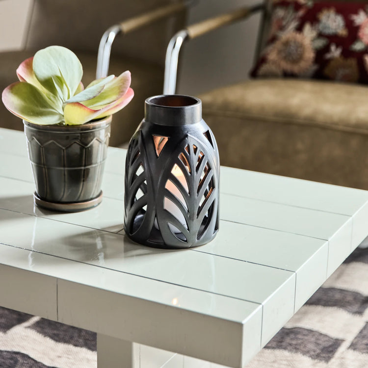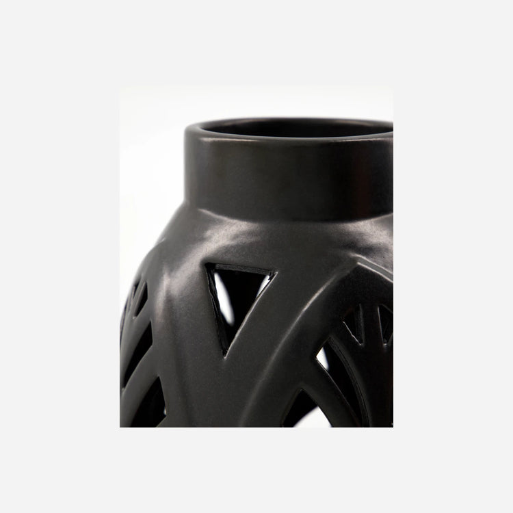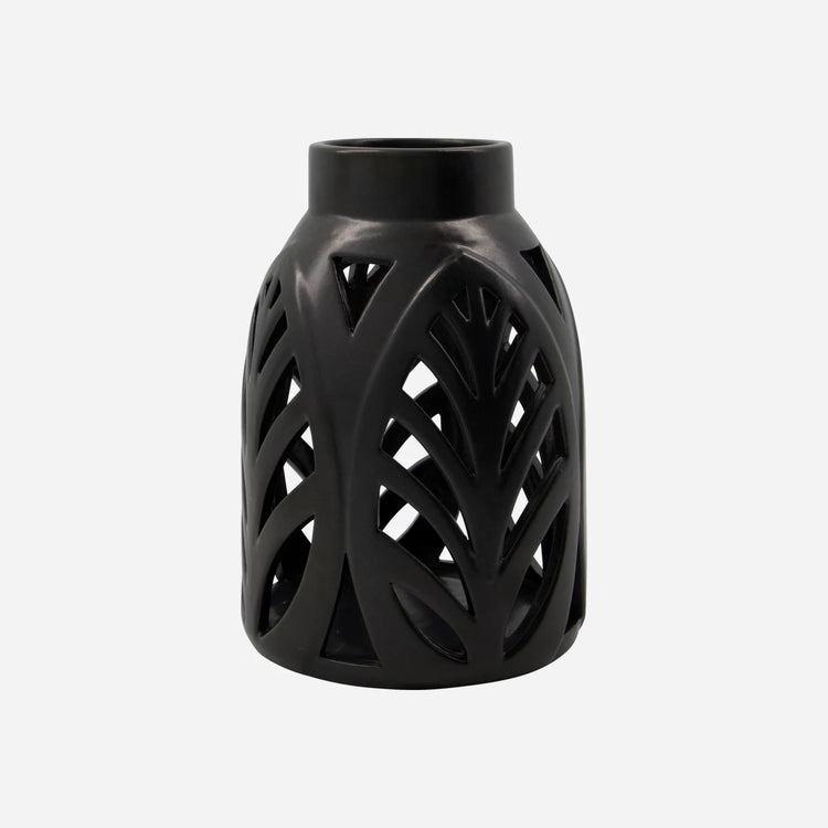 Die Laterne HDElm ist aus schwarzem Steingut gefertigt und besticht durch ihr filigranes, ausgestanztes Pflanzenmuster. Sie zaubert ein faszinierendes Spiel aus Licht und Schatten und wird so zum skulpturalen Blickfang auf einem Konsolentisch oder direkt auf dem Boden.