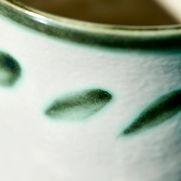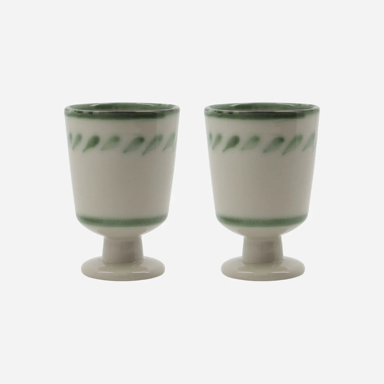 Dieses handgefertigte Becher–Set aus Steinzeug bringt rustikalen Charme und unverwechselbare Gemütlichkeit auf Ihren Tisch. Das Beige wird von einem handgemalten grünen Muster lebendig akzentuiert – kein Becher gleicht dem anderen und jeder ist ein kleines Unikat. Die Fußform bietet angenehme Haptik und macht jede Tasse Kaffee, Tee oder heiße Schokolade zu einem besonderen Moment. Perfekt allein oder kombiniert mit einfarbigen Steinzeugserien für ein harmonisches Gesamtbild. Für eine verspielte Tafel lassen sich verschiedene Muster aus derselben Serie mischen.