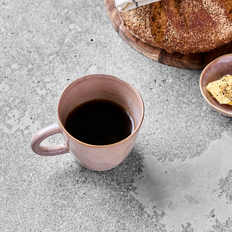 Mit diesen handgefertigten Steingutbechern in sanftem Rosé stimmungsvolle Kaffeemomente genießen. Die natürliche Variation der Glasur und der sichtbare Tonboden verleihen jedem Stück seinen individuellen Charakter.