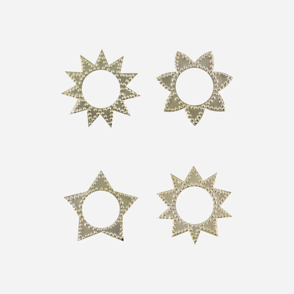 Verleihen Sie Ihrem weihnachtlichen Tischarrangement mit diesen handgefertigten Serviettenringen in antikem Champagnersilber eine elegante Note. Jedes Set enthält vier einzigartige Designs, die durch gestempelte Muster bestechen und Ihrem Gedeck einen Hauch von Vintage verleihen.