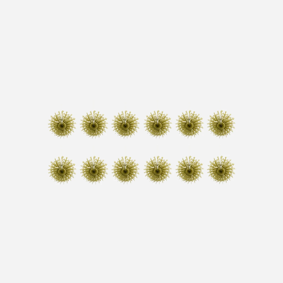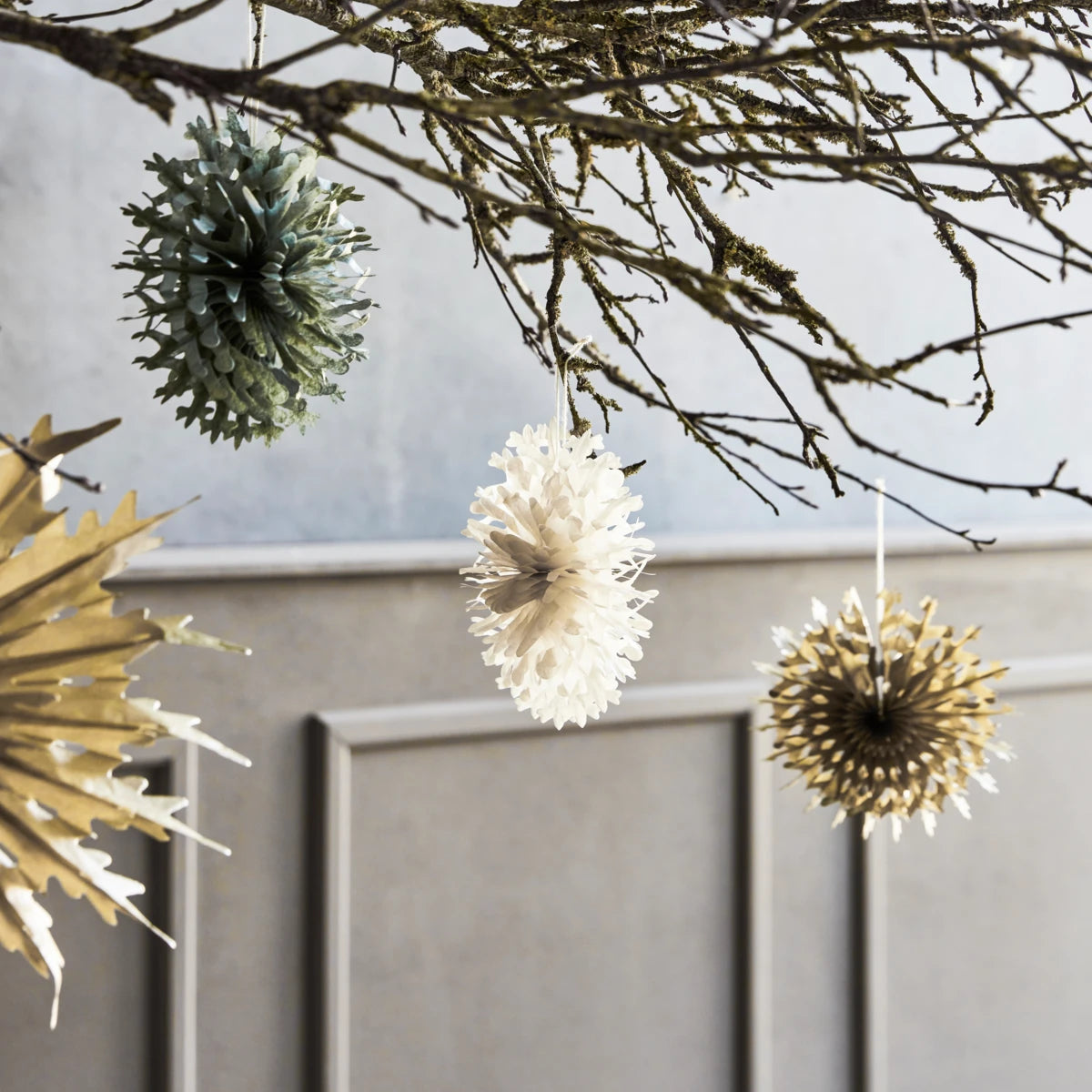 Verleihen Sie Ihrem Zuhause eine festliche Eleganz mit diesen handgefertigten Papierfächern. Die warme goldene Farbe und die filigranen Formen schaffen eine gemütliche und raffinierte Atmosphäre, perfekt für jede Gelegenheit. Hängen Sie sie an den Weihnachtsbaum, an einen Zweig in einer Bodenvase oder über den Esstisch für eine beeindruckende Dekoration.