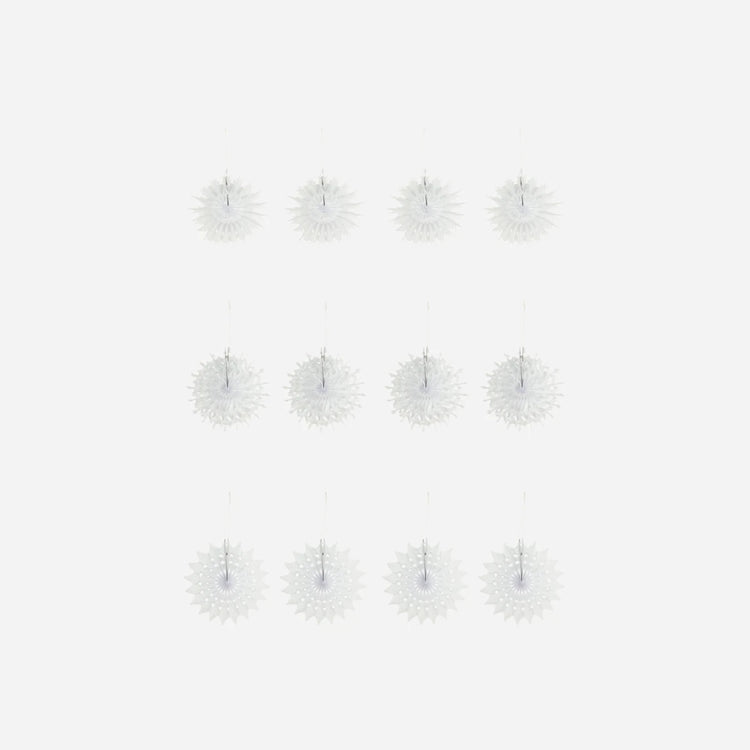Machen Sie Ihre Einrichtung festlicher mit diesem Set aus 12 Papierfächern in 3 verschiedenen Designs. Handgefertigt und in einem zeitlosen Weiß gehalten, verfügen die Fold-Fächer über komplizierte Formen für einen Hauch von Eleganz. Hängen Sie sie an einen Zweig in einer Bodenvase, an die Wand oder an Ihren Weihnachtsbaum. Überall dort, wo Sie einen Hauch Nostalgie hinzufügen möchten. Das ist die Kraft von Papierdekorationen.