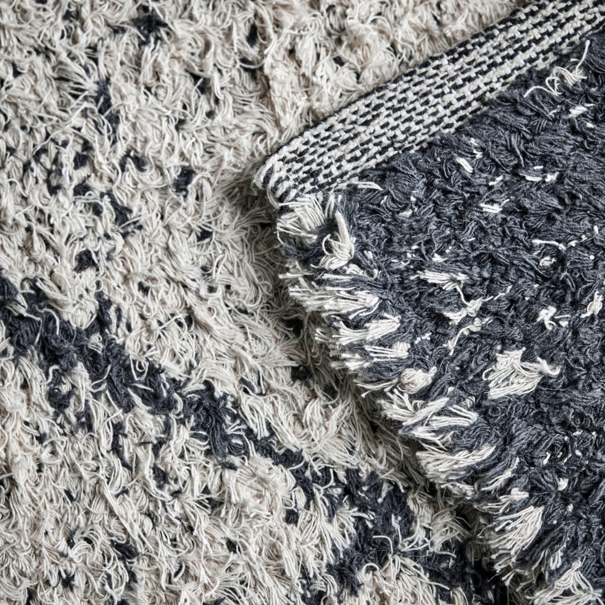 Mit diesem wunderschönen Teppich können Sie Ihrem Zuhause einen Hauch von Eleganz und Vielseitigkeit verleihen. Handgefertigt aus Baumwolle, zeigt er ein ruhiges, grafisches Muster in Schwarz und Cremeweiß, das perfekt zu jeder Einrichtung passt. Das wendbare Design bietet Ihnen zwei einzigartige Looks zur Auswahl, während die Fransen an den Rändern eine charmante, traditionelle Note hinzufügen. Ideal für jeden Raum, ist dieser Teppich sowohl stilvoll als auch praktisch.- Wendbar für vielseitige Gestaltung- Handgefertigt für einzigartigen Charakter- Weiche und langlebige Baumwolle- Fransen für zusätzlichen CharmeVerschönern Sie noch heute Ihr Zuhause mit diesem exquisiten Teppich!