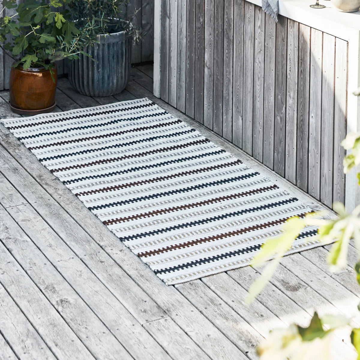 Verleihe deiner Terrasse mit Terra ein zeitloses Style-Upgrade. House Doctor hat den großen rechteckigen Teppich mit einem geometrischen Muster in neutralen Farbtönen versehen, um dir ein besonders zeitloses und mindestens genauso stylishes Wohnaccessoire zu bieten. Der aus recycelten Flaschen gefertigte Teppich ist äußerst robust. Du kannst ihn sowohl drinnen als auch draußen verwenden. Die längliche Form nennt man auch Läufer und ist perfekt, um größeren Außenbereichen ein wohnliches Ambiente zu verleihen zum Beispiel vor deiner Gartenbank oder deinem Lounge-Sofa. Der wunderbar weiche und gemütliche Teppich ist auch eine gute Alternative zu Wollteppichen. Die Farben sind außerdem farbecht und UV-beständig. Bei dem handgemachten Unikat können Farbe, Finish und Größe variieren. Obwohl der Teppich für die Verwendung im Außenbereich geeignet ist, kann ständige Sonneneinstrahlung dazu führen, dass kräftige Farben verblassen. Bei Nässe entweder zum Trocknen aufhängen oder zusammenrollen und in aufrechter Position trocknen lassen. Wir empfehlen, den Teppich regelmäßig zu trocknen, um Schimmelbildung zu vermeiden.