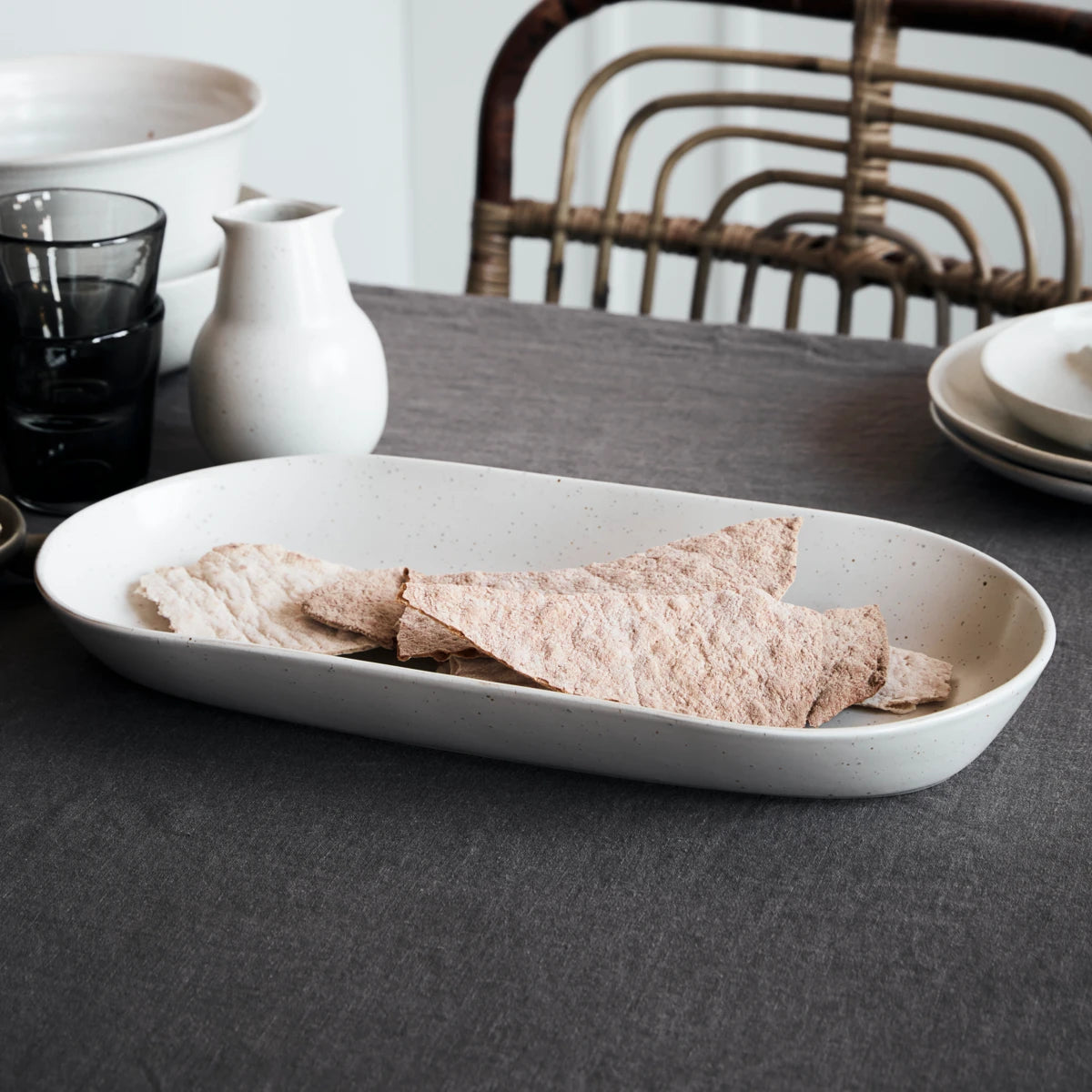 Das Auge isst mit. Auf der großen Servierschale von House Doctor können deine Salate und andere Beilagen sich von der schönsten Seite zeigen. Die langgezogene Form und weiße Farbe sorgen für einen ungezwungenen Touch auf dem gedeckten Tisch besonders wenn du sie mit dem Rest des Pion-Sortiments kombinierst. Steingut sorgt immer für eine rustikale und gemütliche Stimmung, ist aber trotzdem elegant genug, um mit der weißen Glasur aufzufallen. Es kommt ganz darauf an, womit du die Servierschale kombinierst. Auch in Schwarz und in einer kleineren Größe verfügbar.