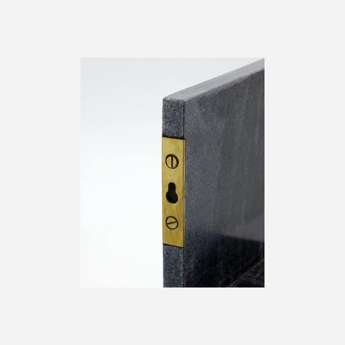 Integrierte Halterungen sorgen für eine harmonische Wandpräsentation. Die Ablage ist an der Wand montierbar oder umgedreht auf dem Badregal oder in der Küche als edler Aufsatz verwendbar – für stilvolle Ordnung oder als Bühne für Ihre Lieblingsstücke. – Aus schwarzem Naturmarmor.