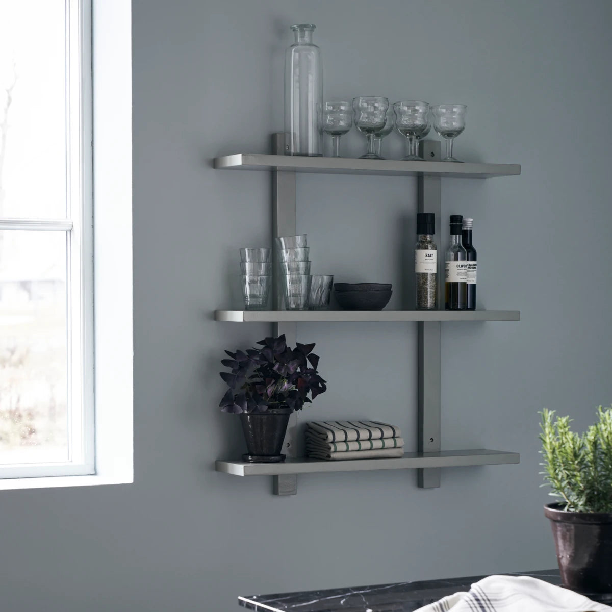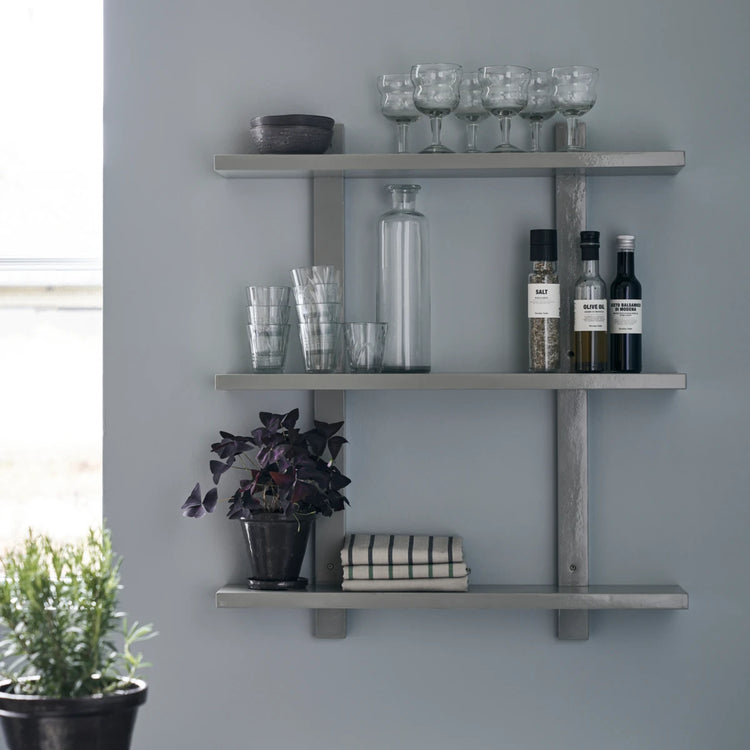 Wandregale sind eine praktische und überaus stylishe Aufbewahrungslösung, bei der du deine Lieblingsgegenstände wunderbar zur Schau stellen kannst. Sheo von House Doctor besteht aus drei Regalböden aus Akazienholz, die mit grauer Farbe und einem Glanzlack überzogen wurden und wunderbar glänzen. Eine einfache und zeitlose Lösung für jede moderne Inneneinrichtung, die etwas Platz für Gläser, Vasen, Kerzenständer und Bücher braucht. Dieses Design sieht absichtlich etwas abgenutzt aus: Die Holzmaserung ist leicht sichtbar und es kann zu kleinen Rissen im Lack kommen. Häng das Wandregal in deinem Wohnzimmer, Schlafzimmer oder in der Küche auf und verwende es als stylishe Aufbewahrungslösung für deine Alltagsgegenstände. Auch in einer größeren Version verfügbar.