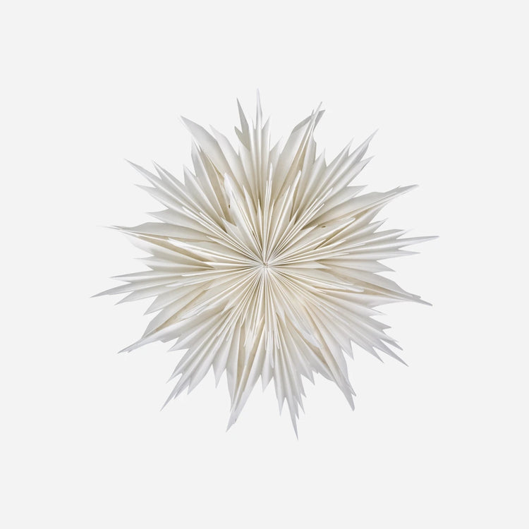Verleihen Sie Ihrem Zuhause einen Hauch von festlicher Eleganz mit diesem handgefertigten Weihnachtsstern aus off-white Papier. Jede Lage Papier entfaltet sich kunstvoll, um einen dreidimensionalen Stern zu formen, der Licht auf faszinierende Weise reflektiert.