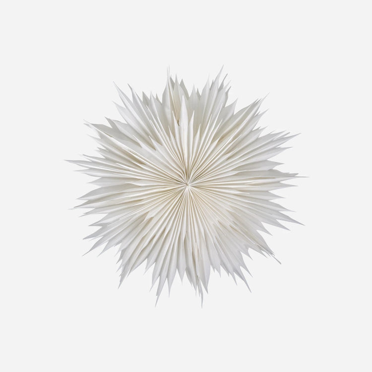 Verleihen Sie Ihrem Zuhause eine stilvolle und festliche Atmosphäre mit diesem eleganten, handgefertigten Stern aus off-white Papier. Die vielschichtige Struktur und das moderne Design machen ihn zum perfekten Weihnachtsschmuck für Fenster oder Decken.