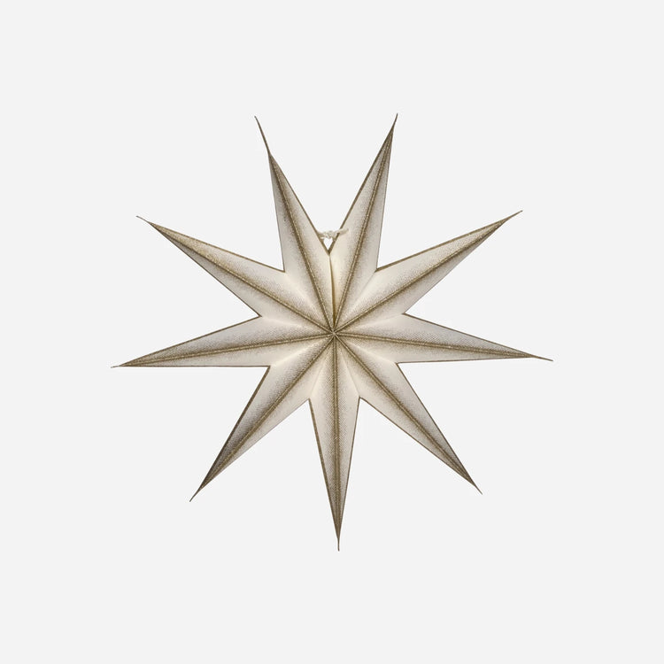 Verzaubern Sie Ihr Zuhause mit dieser handgefertigten, sieben-zackigen Papierstern-Dekoration in einem eleganten Off-White mit schimmerndem Champagner-Glitzer. Perfekt für die Weihnachtszeit, strahlt sie magisches Sternenlicht aus und verleiht Ihrem Raum eine exklusive, moderne Note.