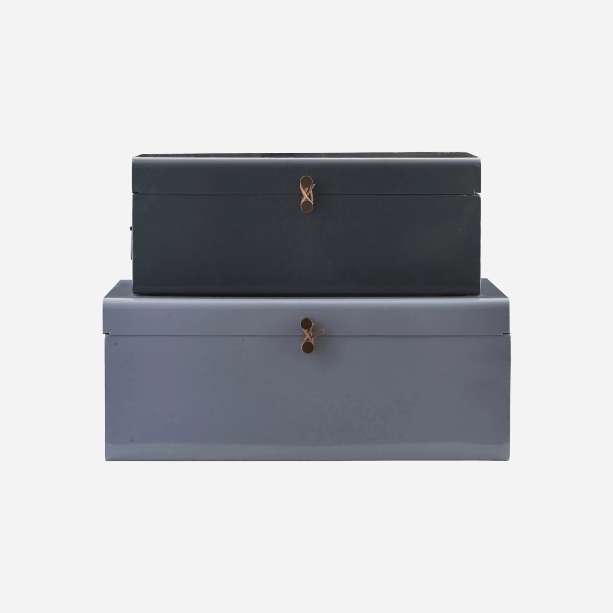 Schönes Koffer-Set von House Doctor aus Stahl. Das Koffer-Set besteht aus zwei schönen Koffern in unterschiedlichen Größen. Perfekt geeignet für die Aufbewahrung von Spielsachen im Kinderzimmer oder für Magazine, Büro-Artikel und andere Dinge und Gegenstände, die nicht im Weg liegen sollen. Die Koffer passen fantastisch in das moderne Zuhause und in jeden beliebigen Raum. Das Set ist aus zwei schönen blauen Farbtönen zusammengesetzt. Die Koffer lassen sich mit einer feinen, kleinen Lederschnur verschließen, die ein zusätzliches Detail darstellt und einen spannenden Kontrast zum Stahl bildet. Der große Metallkoffer hat eine hübsche hellblaue Nuance, während der kleinere Koffer in ansprechendem Dunkelblau gehalten ist. Verwenden Sie sie als schlichtes, dekoratives Detail in Ihrer Einrichtung.
