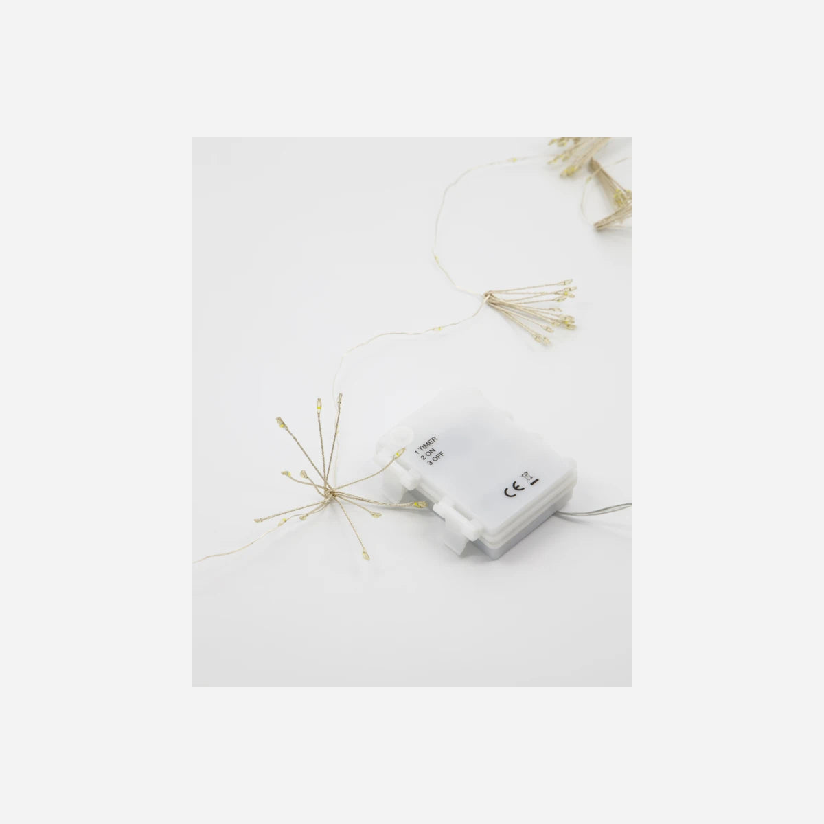 Diese wunderschöne Lichterkette gibt Ihrem Zuhause eine einladende Atmosphäre. Mit 138 kleinen LED-Lichtern auf einem silberbeschichteten Kupferdraht verleiht diese Dekoration einen festlichen Touch. Einfach die LED-Stränge entfalten, um 10 wunderschöne Sternformationen zu enthüllen, die Ihre Tischdekoration erhellen. Ob um einen Kranz gewickelt, am Weihnachtsbaum aufgehängt oder als Teil einer festlichen Tischdekoration verwendet, die Lichter sorgen für ein warmes Leuchten, das jeden Raum verschönert. Sie sind batteriebetrieben und besitzen eine praktische Timerfunktion, wodurch diese vielseitige Dekoration überall eingesetzt werden, wo Ihre Kreativität Sie hinführt.