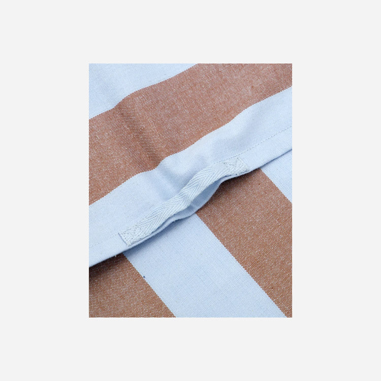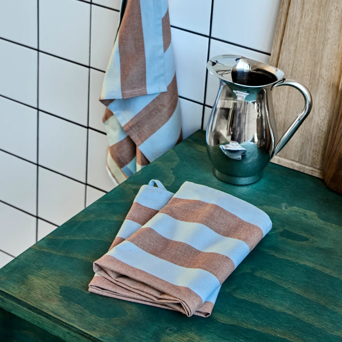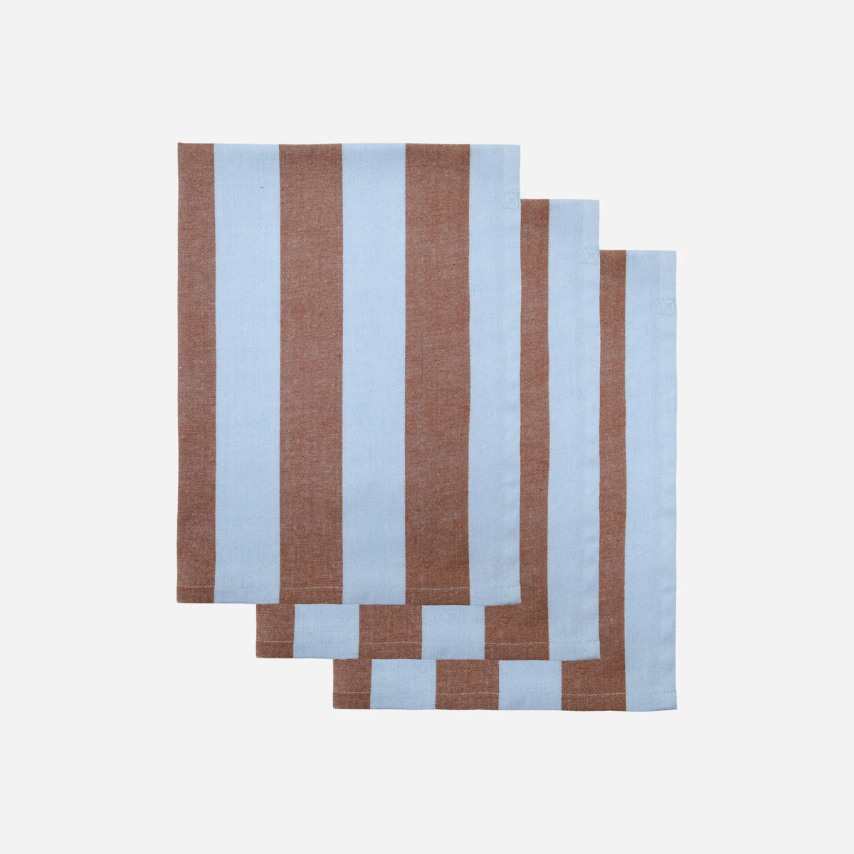 Ein Set aus drei Geschirrtüchern aus Baumwolle mit einem gewebten Streifenmuster in Braun- und Hellblautönen. Die HDCook-Geschirrtücher sind besonders saugstark und strapazierfähig und damit die idealen Begleiter für den Küchenalltag.