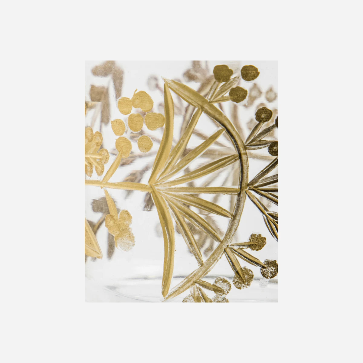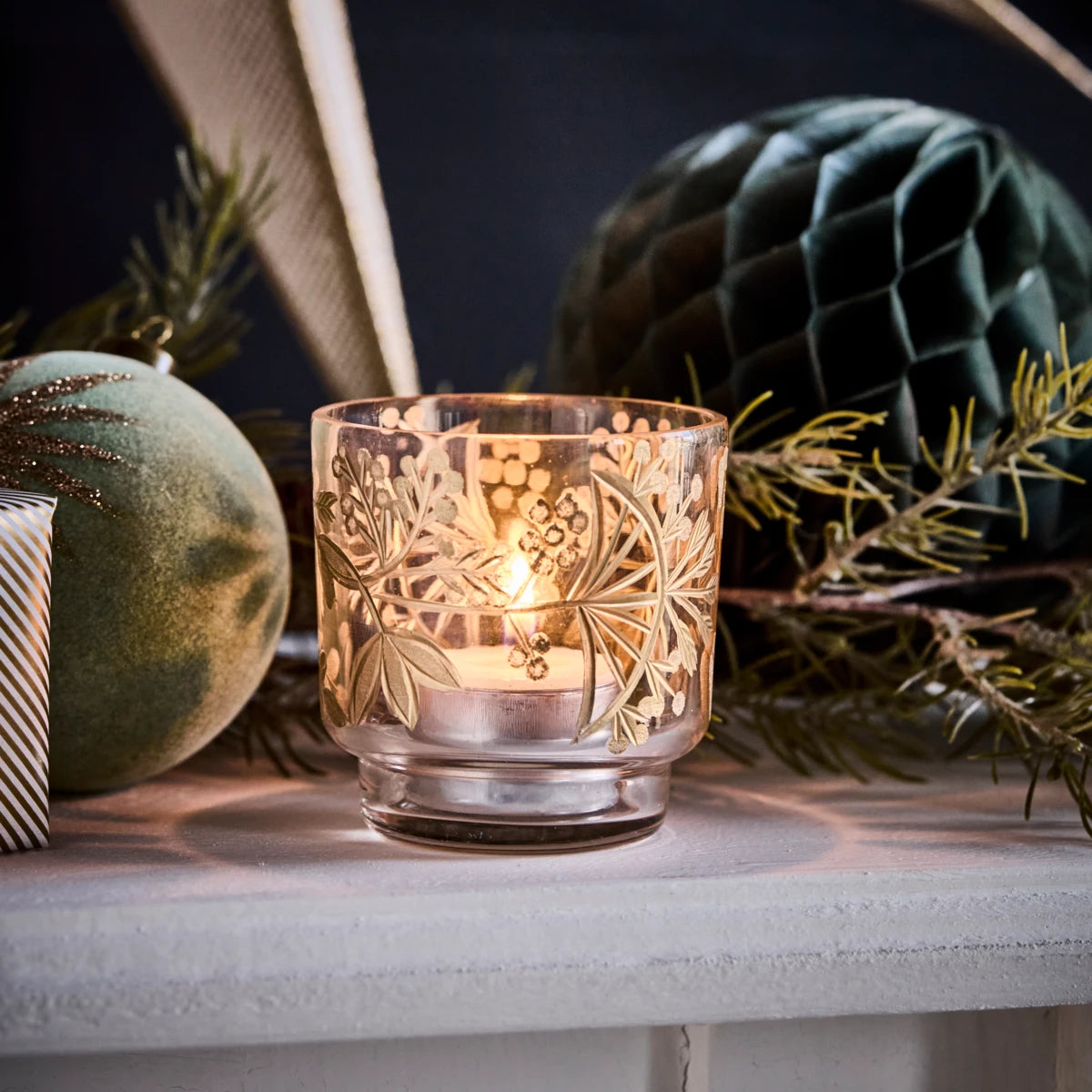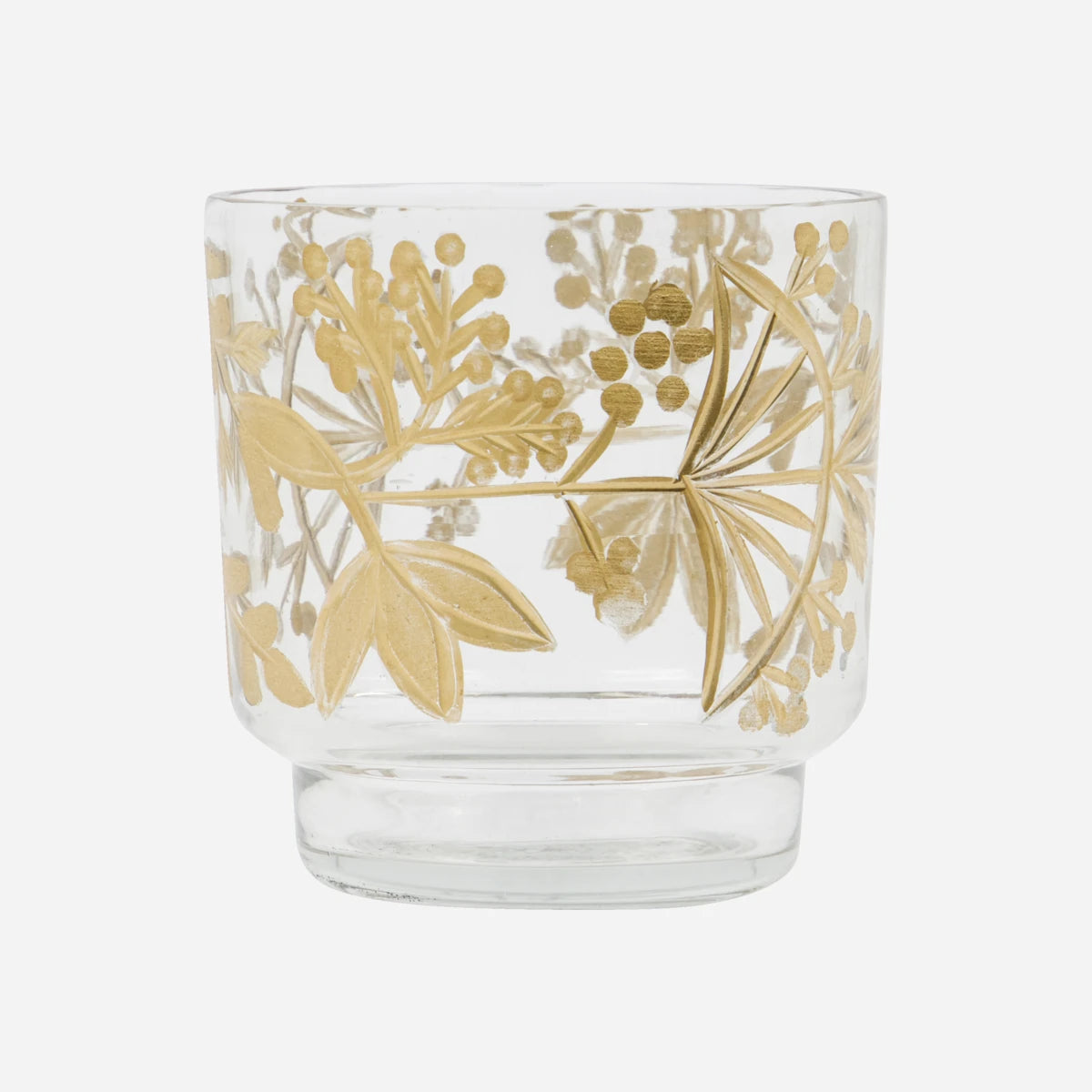 Verleihen Sie Ihrem Zuhause einen Hauch von festlichem Glanz mit diesem handgefertigten Teelichthalter aus klarem Glas. Die kunstvollen Facetten sind liebevoll mit goldener Farbe bemalt und verleihen dem Halter einen eleganten Vintage-Look.