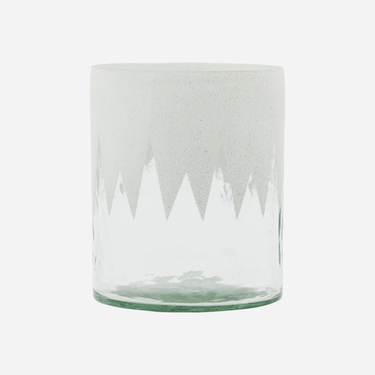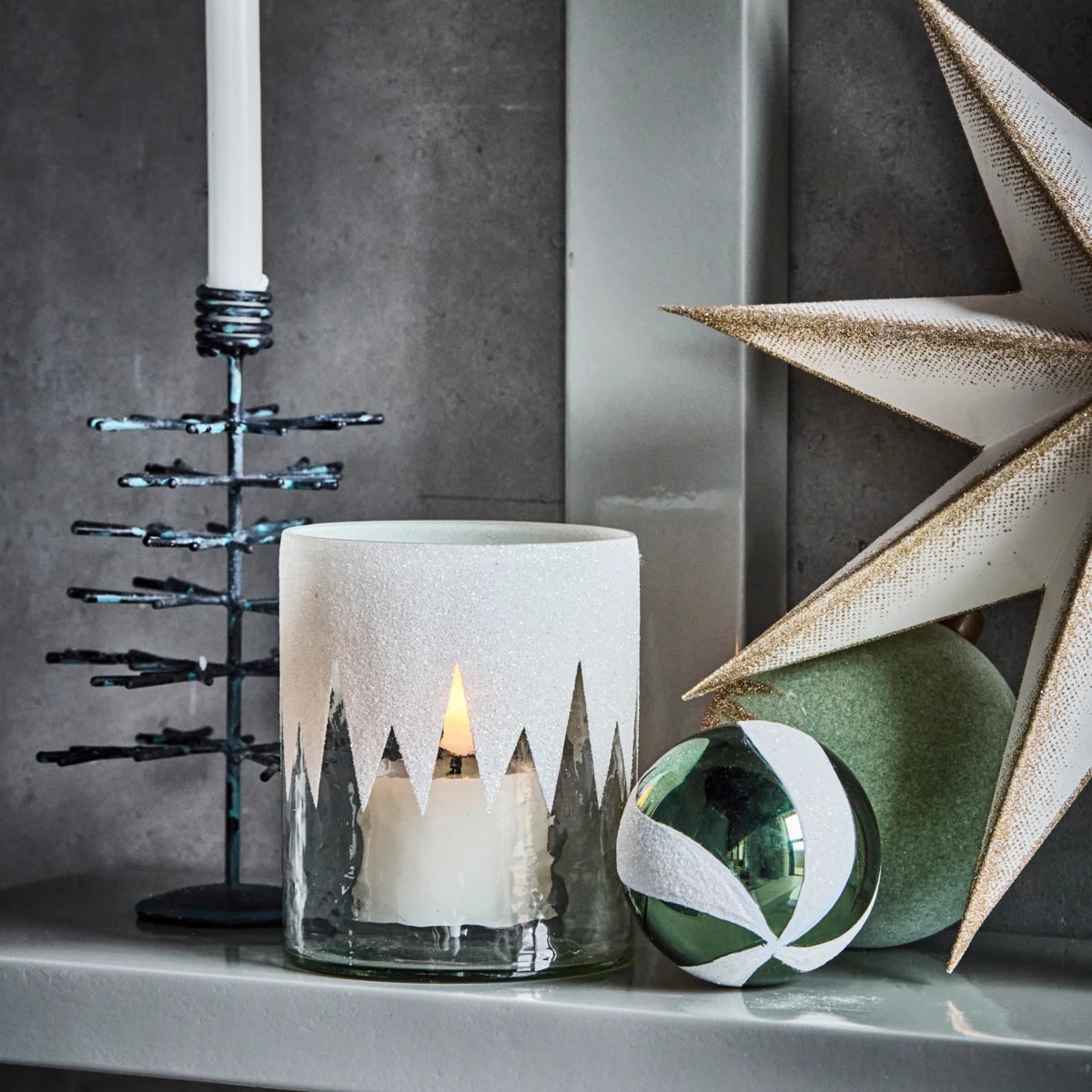 Verleihen Sie Ihrem Zuhause in der Weihnachtszeit einen Hauch von Zauber mit diesem handgefertigten Teelichthalter aus Glas. Die dezente grüne Nuance und die eingebetteten Bläschen verleihen jedem Stück eine einzigartige Note. Der mit Glitzer verzierte, weiße Rand erinnert an funkelnde Eiszapfen und sorgt für eine magische Atmosphäre.