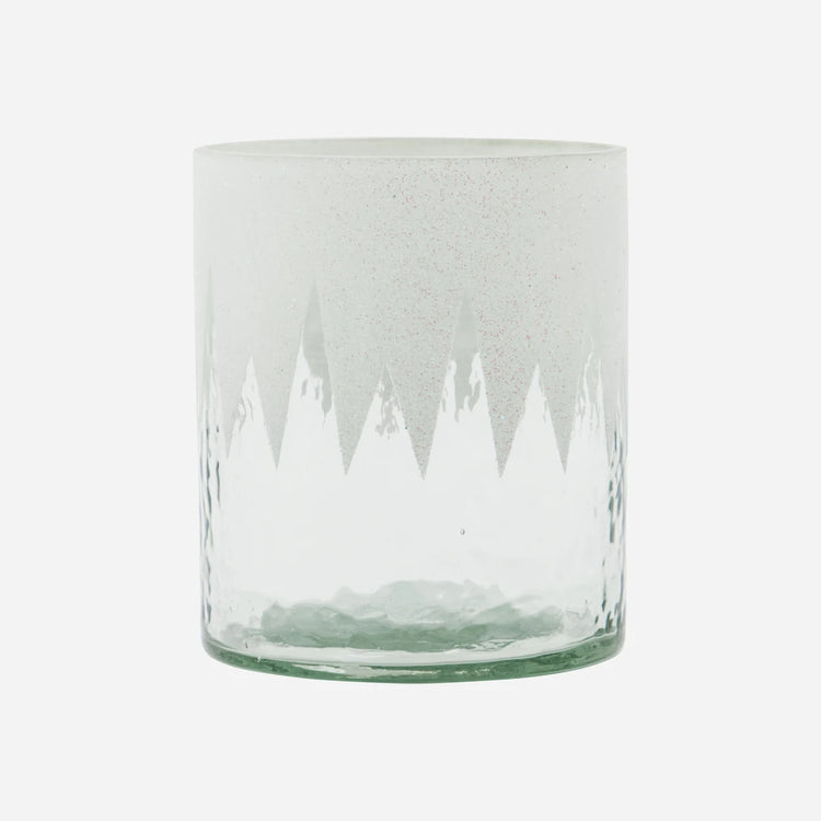 Verleihen Sie Ihrem Weihnachtsdekor mit diesem handgefertigten Teelichthalter aus Glas eine magische Note. Die zarte grüne Tönung und die charakteristischen Blasen des Glases verleihen jedem Stück eine einzigartige Ausstrahlung. Der obere Rand ist mit einer dicken, weißen Schicht verziert, die an glitzernde Eiszapfen erinnert und eine moderne, coole Ästhetik schafft. Dieser Halter ist perfekt, um eine gemütliche und einladende Atmosphäre während der Feiertage zu kreieren.