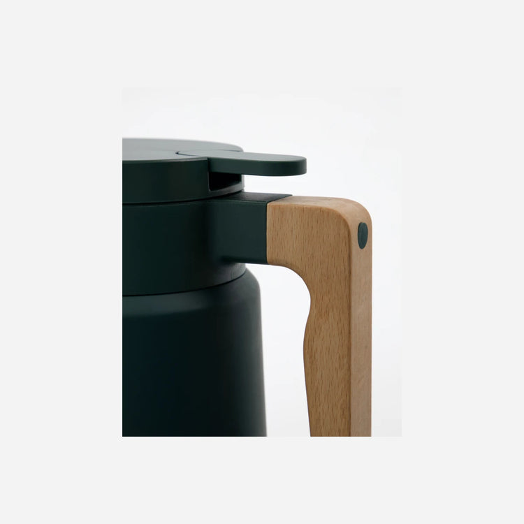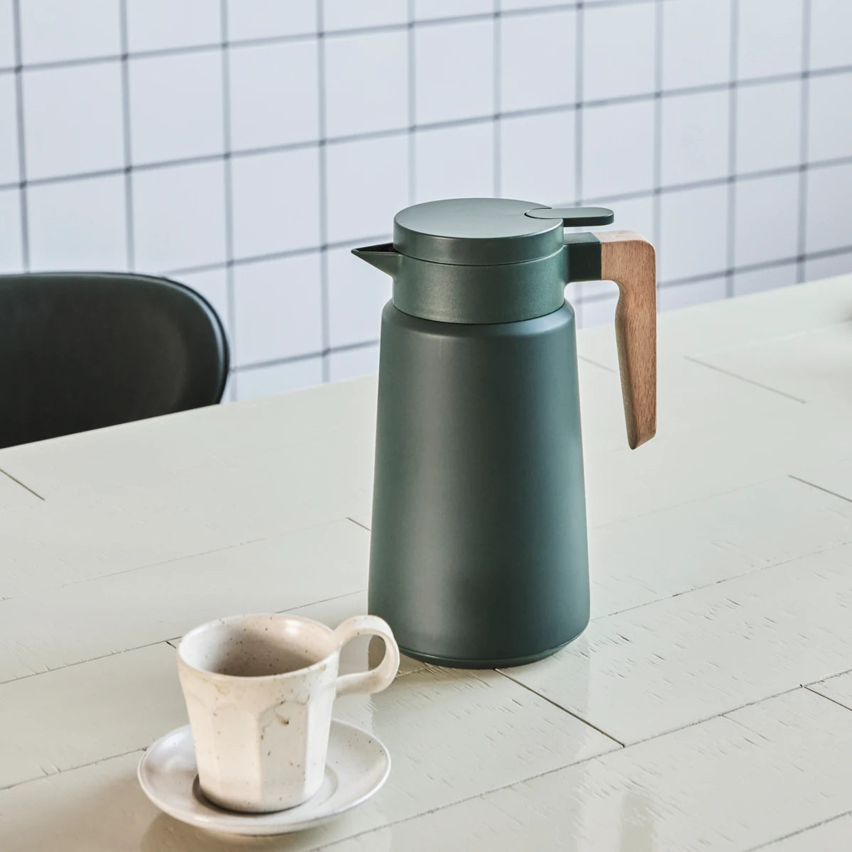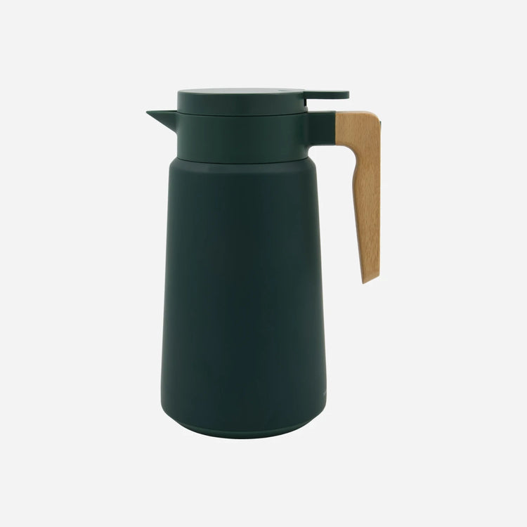 Eine Tasse heißer Kaffee an einem kühlen Morgen oder eiskaltes Wasser für ein Picknick? Diese Thermoskanne in einem tiefen Dunkelgrün wurde designt, um deine Getränke stundenlang auf Temperatur zu halten. Sie ist aus Edelstahl gefertigt und mit einem praktischen Griff versehen, sodass du sie überallhin mitnehmen kannst – egal ob drinnen oder draußen. br>