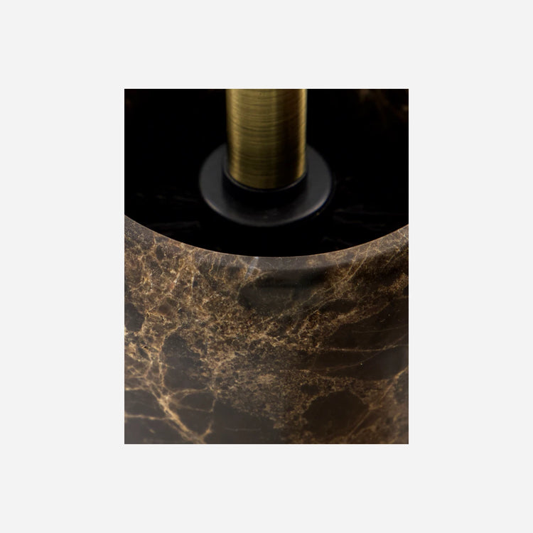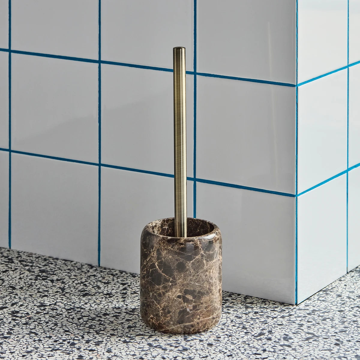 Diese Toilettenbürstenhalter aus massivem, braun marmoriertem Stein verleiht jedem Bad individuellen Charakter. Jeder Halter ist ein Unikat: Die natürliche Maserung und die polierte Oberfläche sorgen für einen luxuriösen Look, der messingfarbene Griff rundet als warmer Akzent das Design ab. Klassisch und stilvoll fügt sich die Bürste ganz selbstverständlich ins Wohlfühlbad ein – egal, ob modern, gemütlich oder zeitlos eingerichtet. Kombinierbar mit weichen Handtüchern, einem Holztablett oder einer Kerze für die eigene Spa-Atmosphäre.