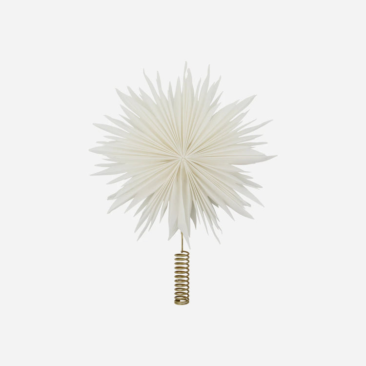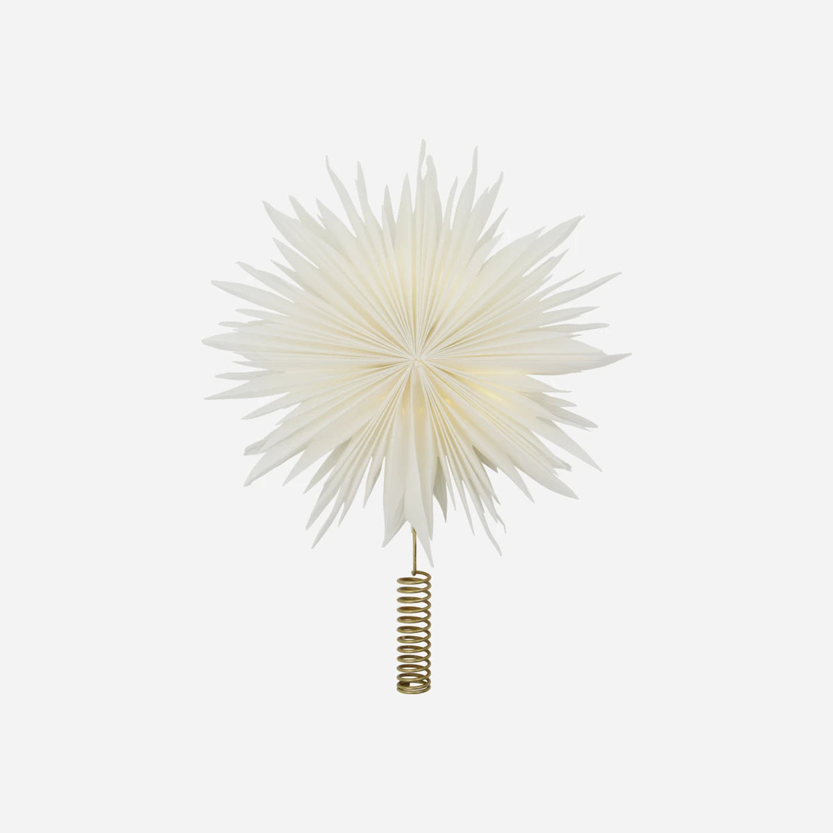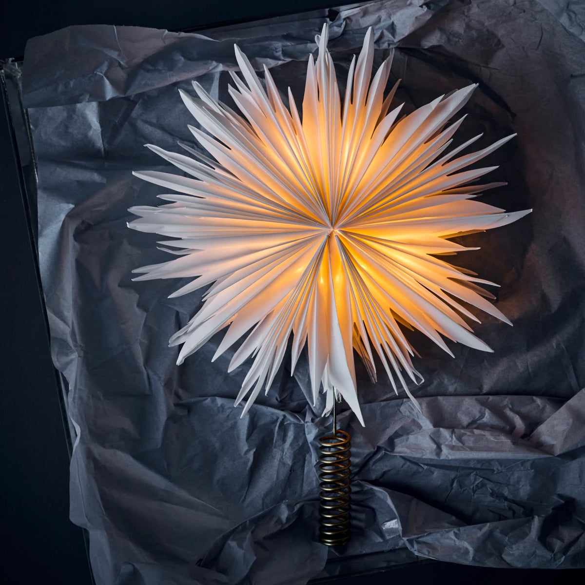 Verleihen Sie Ihrem Weihnachtsbaum eine besondere Note mit dieser eleganten Baumspitze. Die kunstvoll gestaltete weiße Papierstern bringt mit integrierten LEDs einen magischen Glanz in Ihr Zuhause. Der Spiralhalter aus Eisen mit Messing-Finish sorgt für sicheren Halt und eine edle Optik.