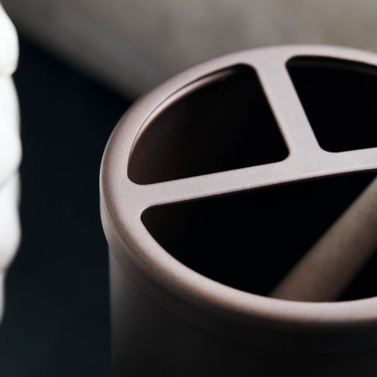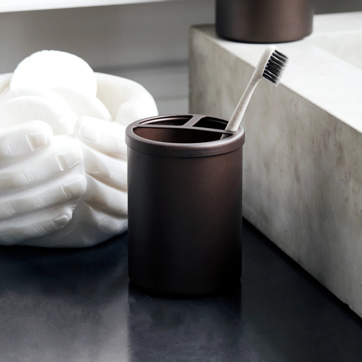 Verwende diesen Aluminium-Becher für ein schnelles Badezimmer-Makeover, das wirklich nicht die Welt kostet. Bush wurde von House Doctor designt und kommt in einem matten Braunton daher, der deiner Badezimmerdeko einen zeitlosen und doch modernen Touch verleiht. Du kannst ihn als Zahnbürstenbecher nutzen und deine Zahnbürsten in die zwei kleineren Fächer stellen, während das große Fach perfekt für Zahnpasta ist. Wenn du den Becher reinigen möchtest, kannst du ganz einfach den Deckel abnehmen. Kombiniere ihn mit dem Seifenspender im gleichen Design um einen einheitlichen Look zu erzielen.