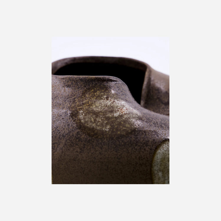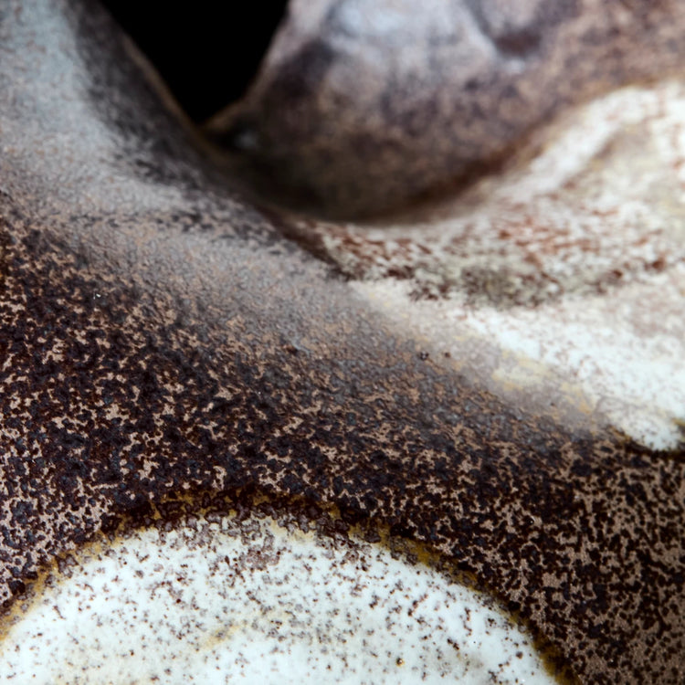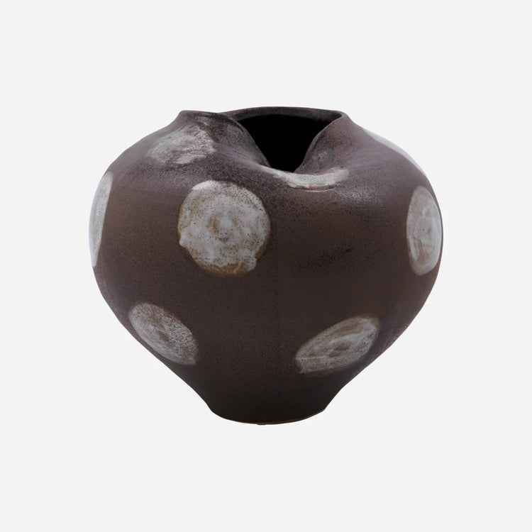 Diese handgefertigte Vase aus Steingut bringt mit ihrem warmen Braun und dem künstlerischen cremefarbenen Muster moderne Bohème-Atmosphäre in Ihr Heim.