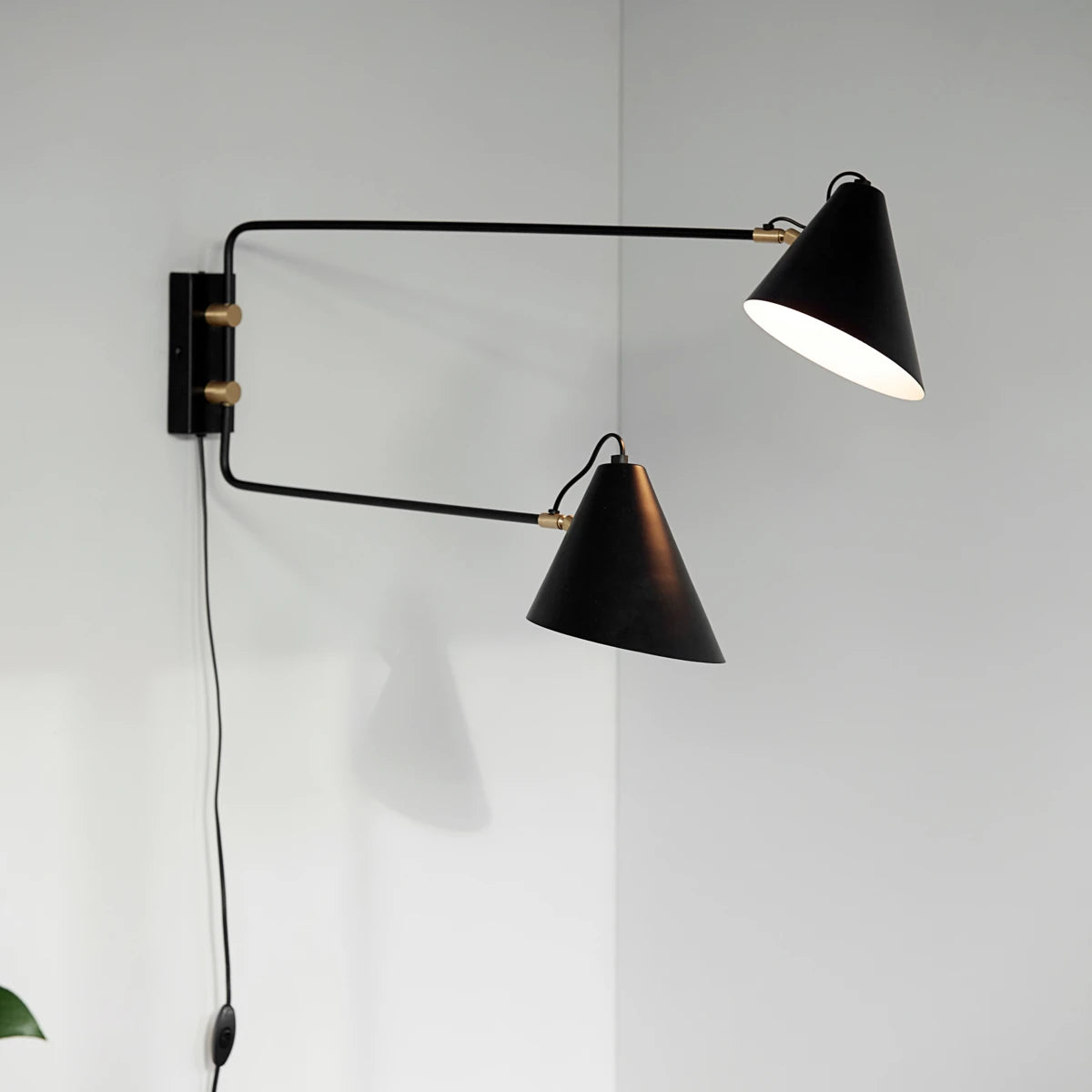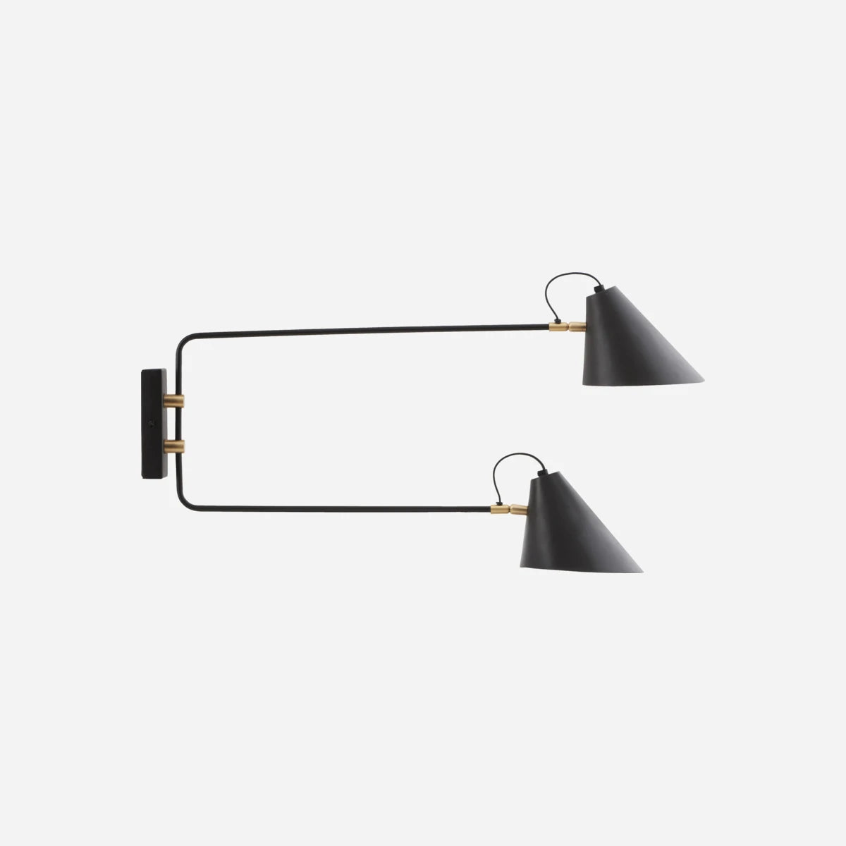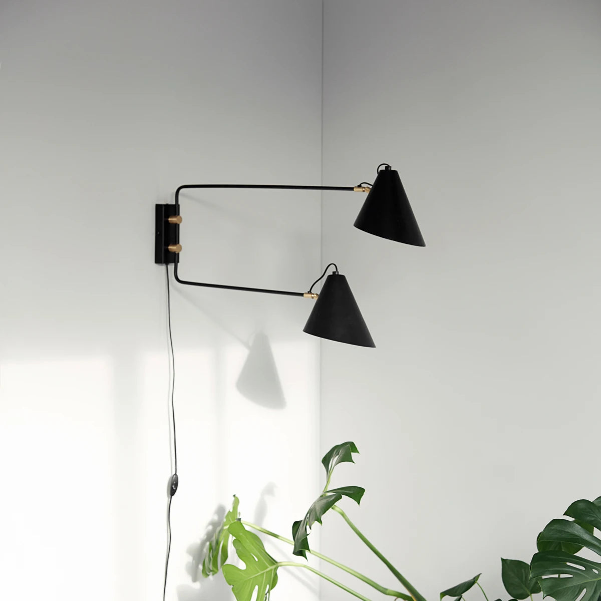 Lampen hellen die Dunkelheit auf und bringen Wärme und Stil in Ihre Einrichtung. Mit der dekorativen Wandleuchte Club Double von House Doctor erhalten Sie sowohl ein stimmungsvolles Licht für Ihr Zuhause als auch eine schöne Dekoration für Ihre Wand. Eigentlich vereint die Lampe zwei Lampen in einer. Das industrielle Design verleiht der Lampe einen skulpturalen Ausdruck. Die Kombination aus schwarzem Eisen und goldenem Messing gibt dem Design außerdem einen schönen, warmen Touch. Die Lampe hat mehrere Funktionen. Die Arme können zu beiden Seiten bewegt werden, sodass Sie die Beleuchtung Ihrem Bedarf anpassen können.